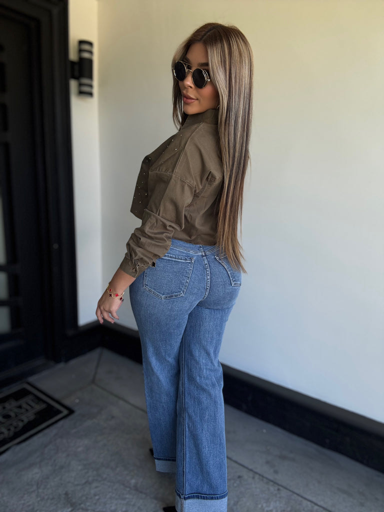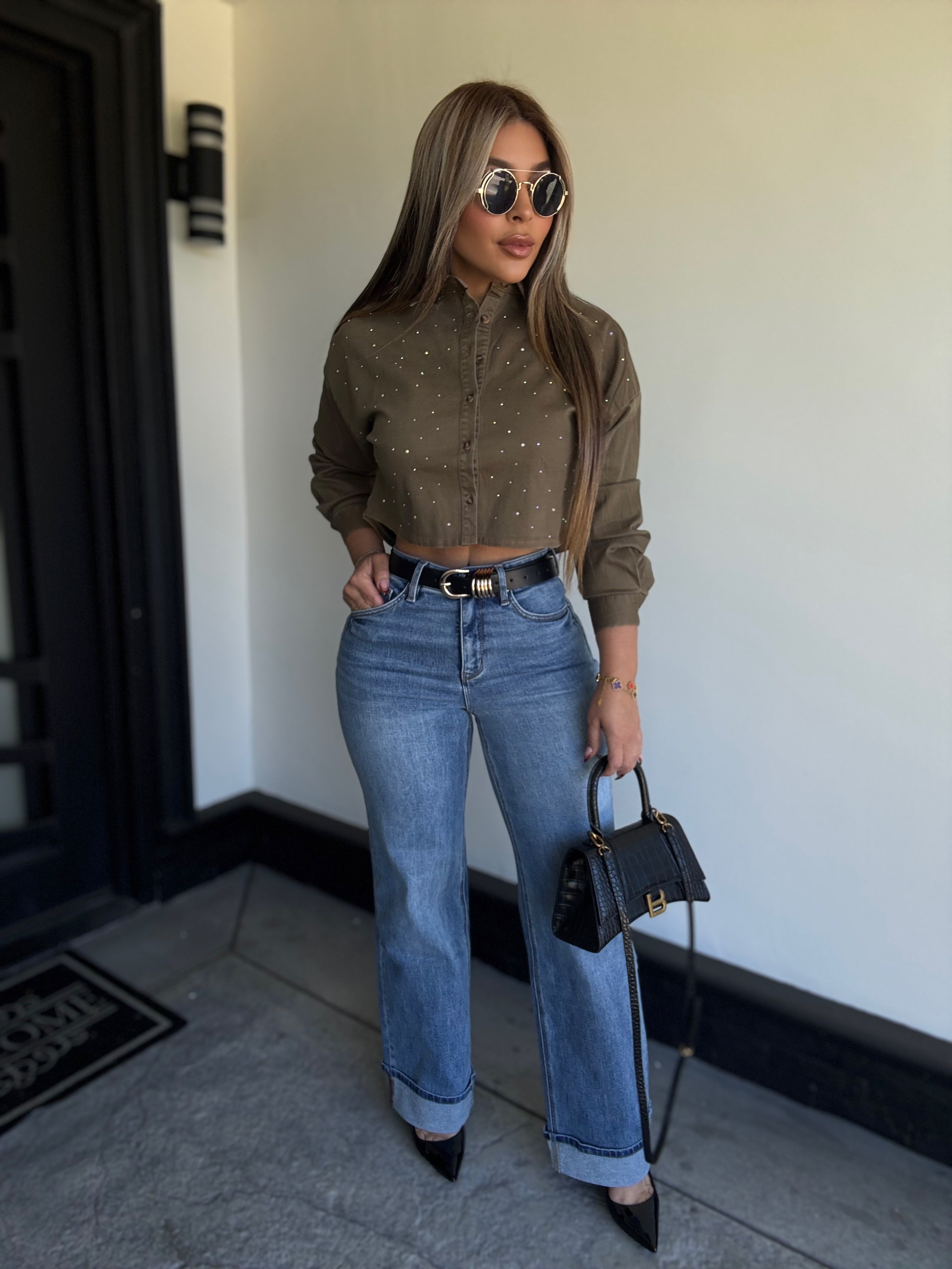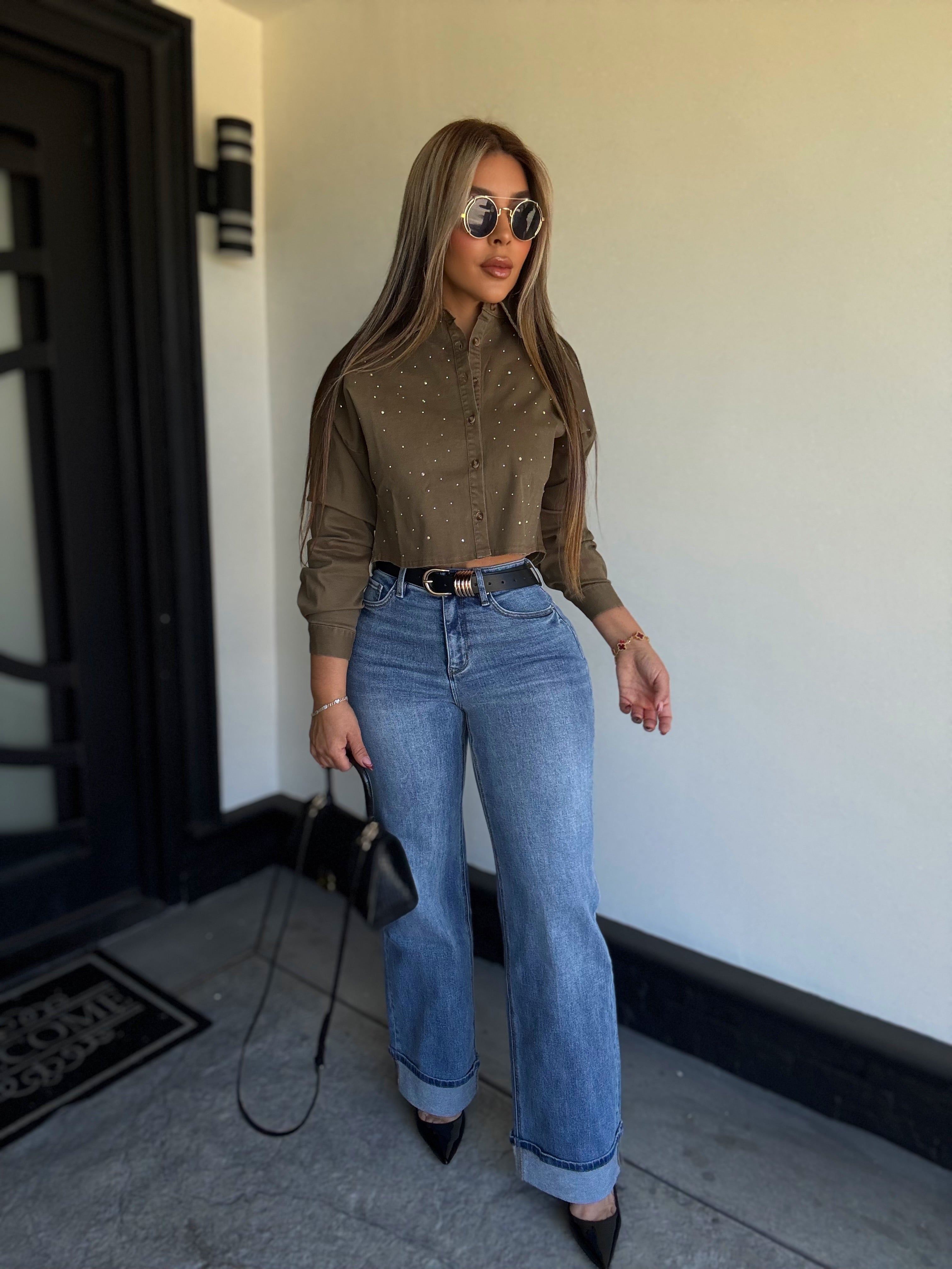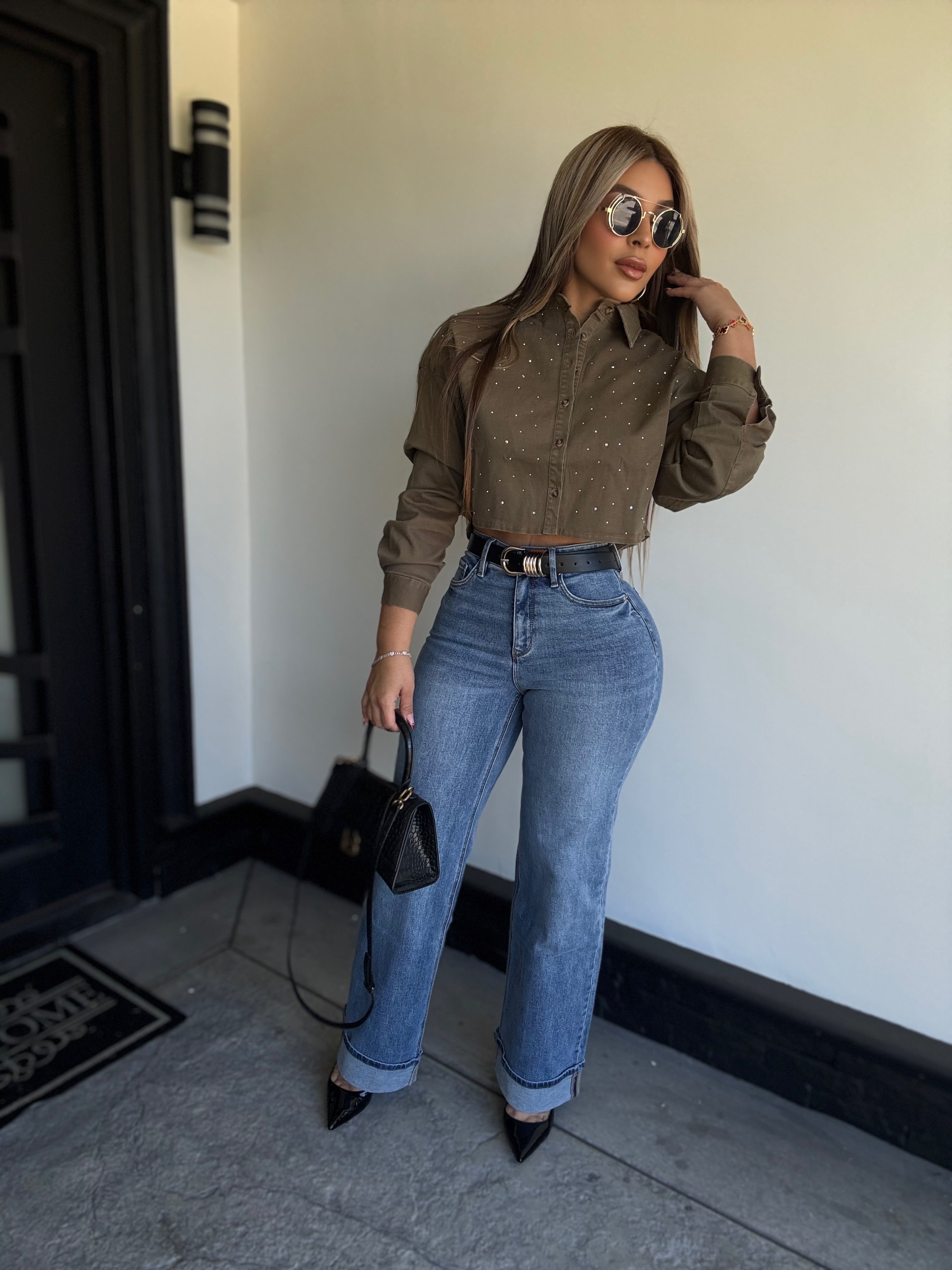 Details : Long sleeve button down top made from stretch material model is wearing size small , model is 5.5 height , 38 in bust, 25 in waist and 42 in hips .