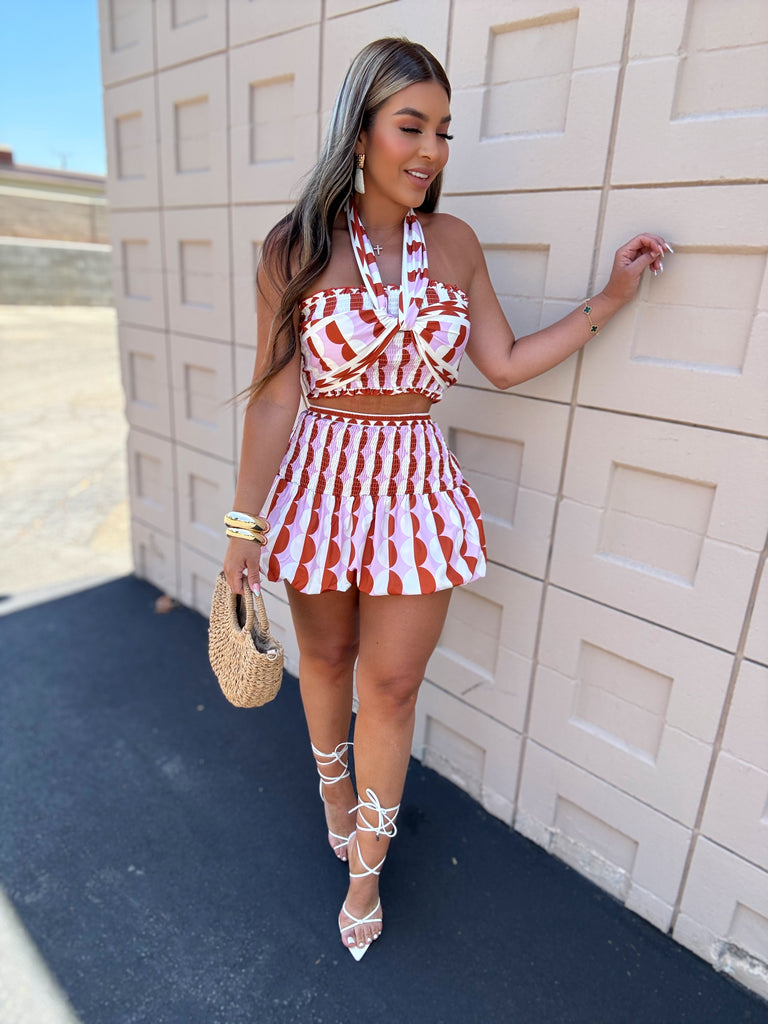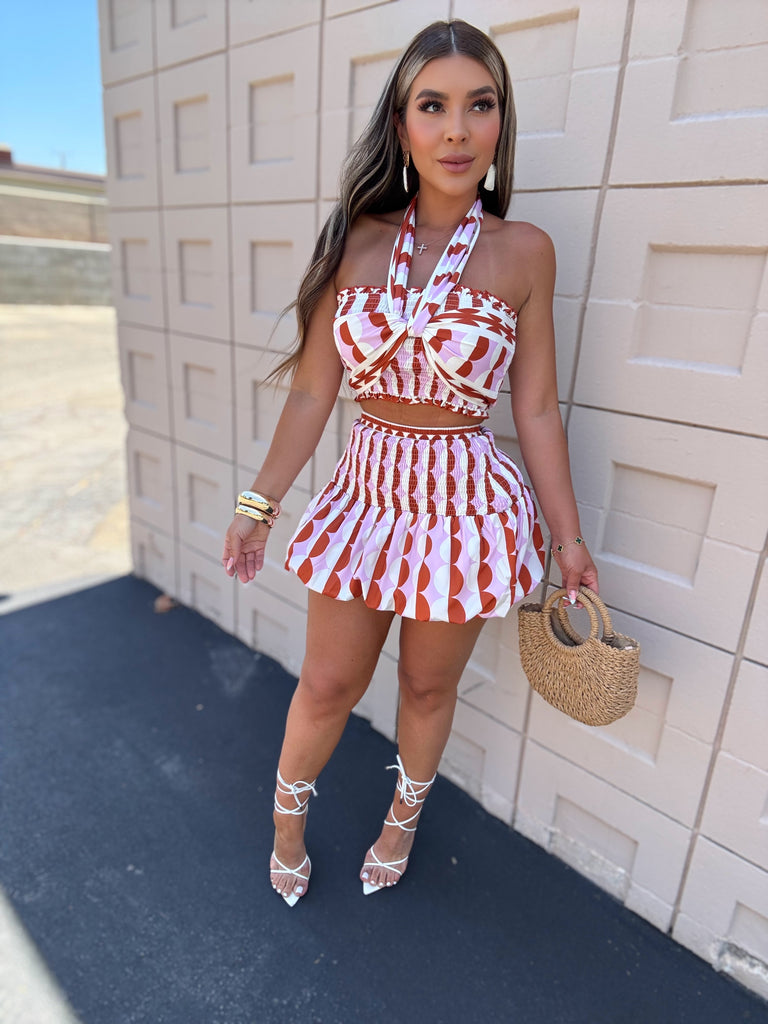 Details: Sleeveless top with skirt set made from stretch material , very comfortable model is wearing size small,model is 5.5 height , 38 in bust , 24 in waist and 42 in hips .