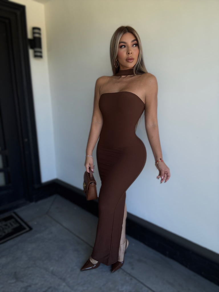 Details : Sleeveless maxi bodycon dress with neck scarf made from stretch material model is wearing size small , model is 5.5 height , 38 in bust , 25 in waist and 42 in hips .