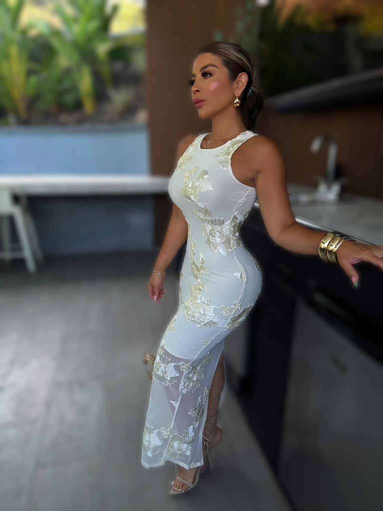 Details : Sleeveless maxi dress made from mesh stretch material model is wearing size small , model is 5.5 height , 38 in bust , 25 in waist and 42 in hips .