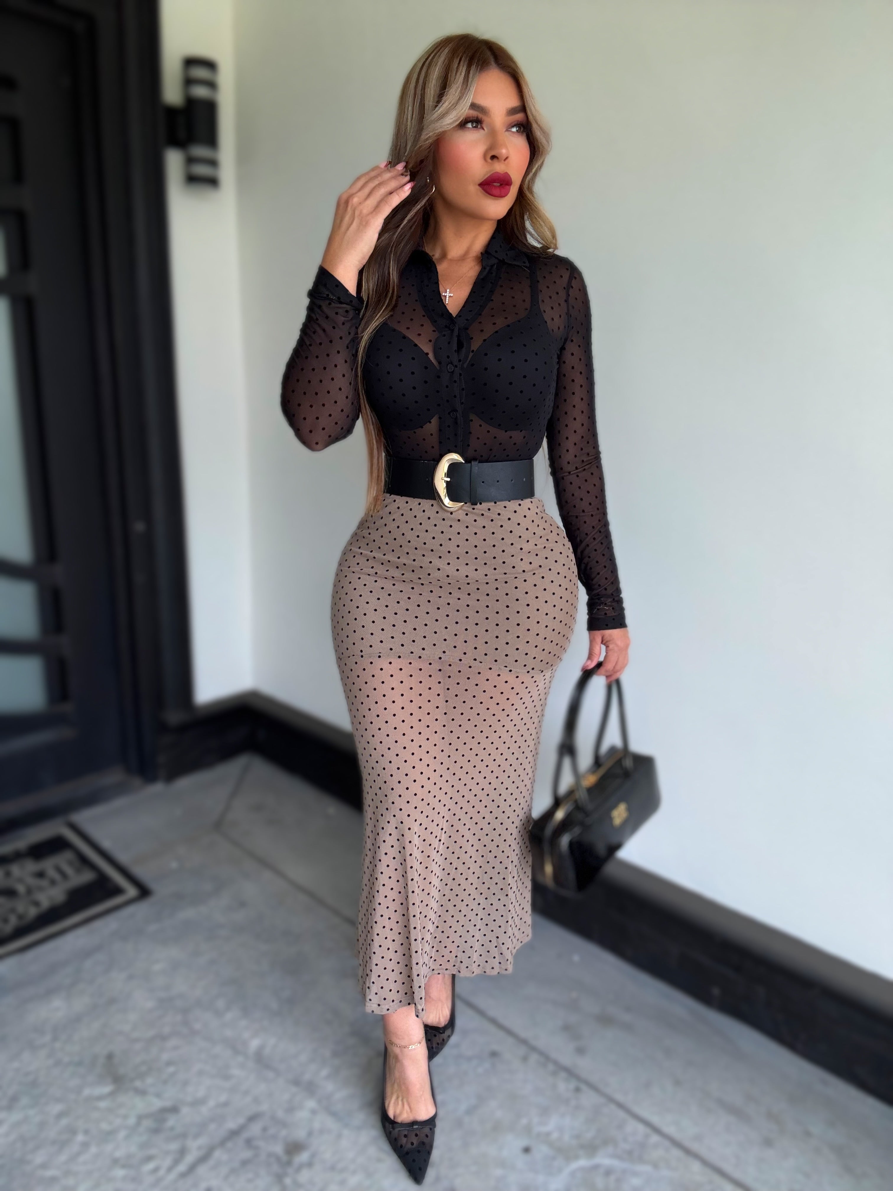 Details: Maxi skirt made from stretch mesh material true to size , model is wearing size small , model is 5.5 height , 38 in bust , 25 in waist.