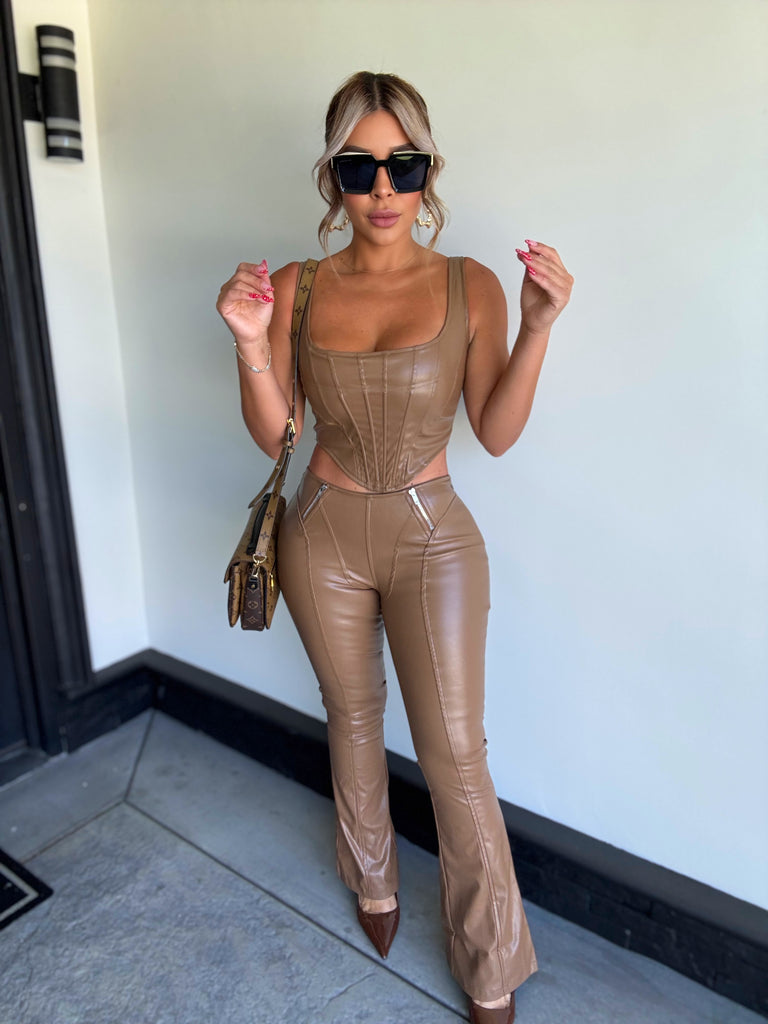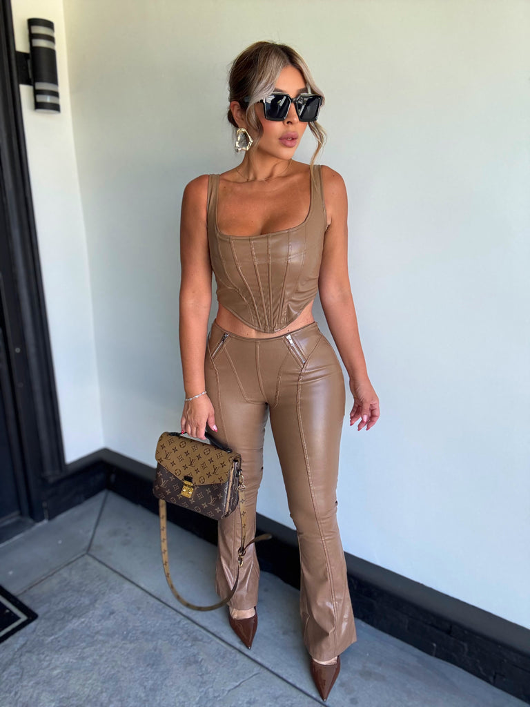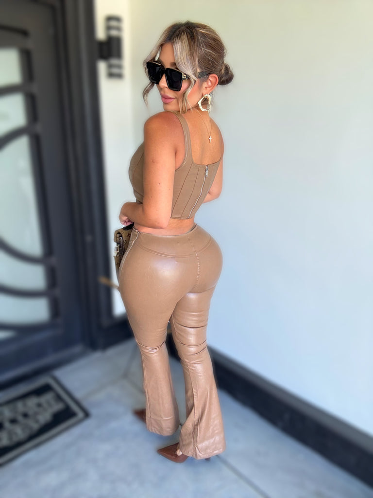 Details: Sleeveless cropped top with pants set made from faux leather material with stretch , very comfortable model is wearing size small ,model is 5.5 height , 38 in bust , 24 in waist and 42 in hips .
