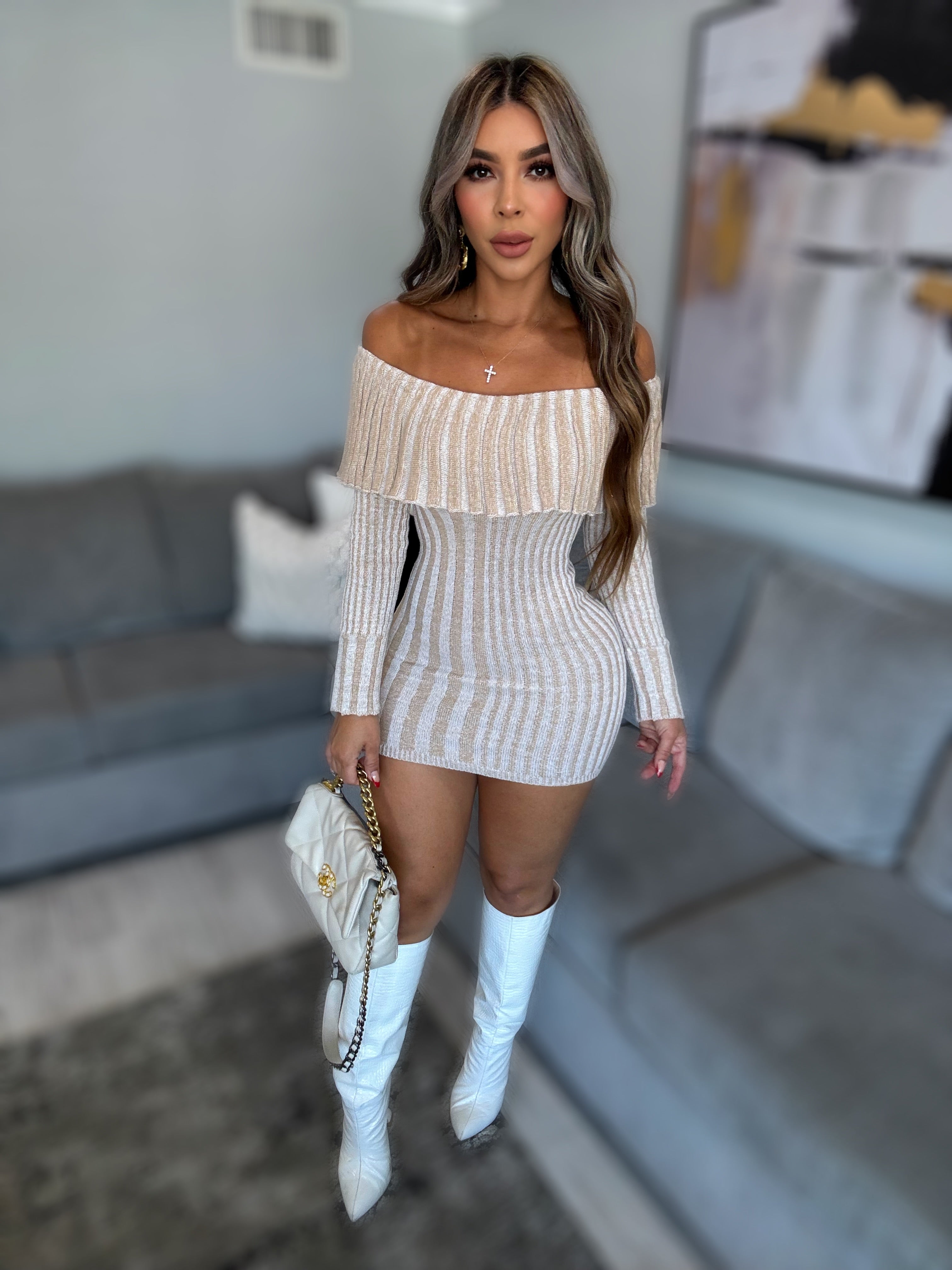 Details : Long sleeve off shoulder mini dress made from stretch material model is wearing size small, model is 5.5 height , 38 in bust , 25 in waist and 42 in hips .