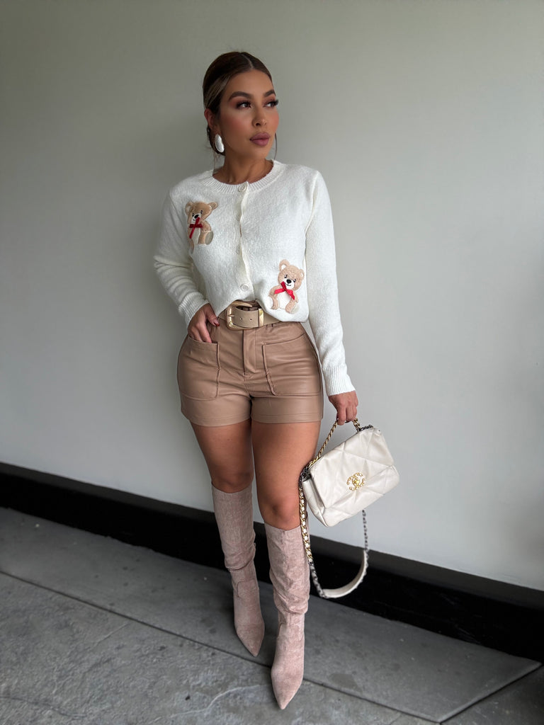Details: High waisted faux leather shorts made from stretch material , model is wearing size small, model is 5.5 height ,24 in waist and 42 in hips .