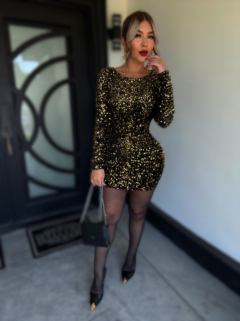 Details : Long sleeve sequins mini dress made from stretch material model is wearing size small , model is 5.5 height , 38 in bust , 25 in waist and 42 in hips .
