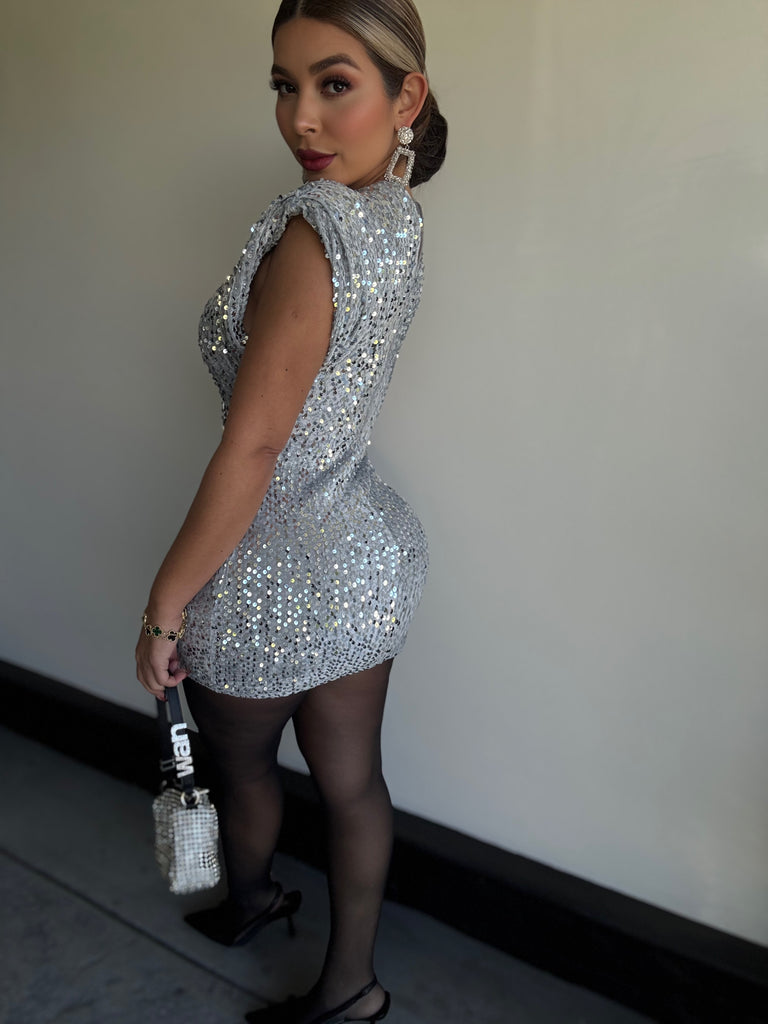Details : Sleeveless sequins mini dress made from stretch material model is wearing size small, model is 5.5 height , 38 in bust , 25 in waist and 42 in hips .