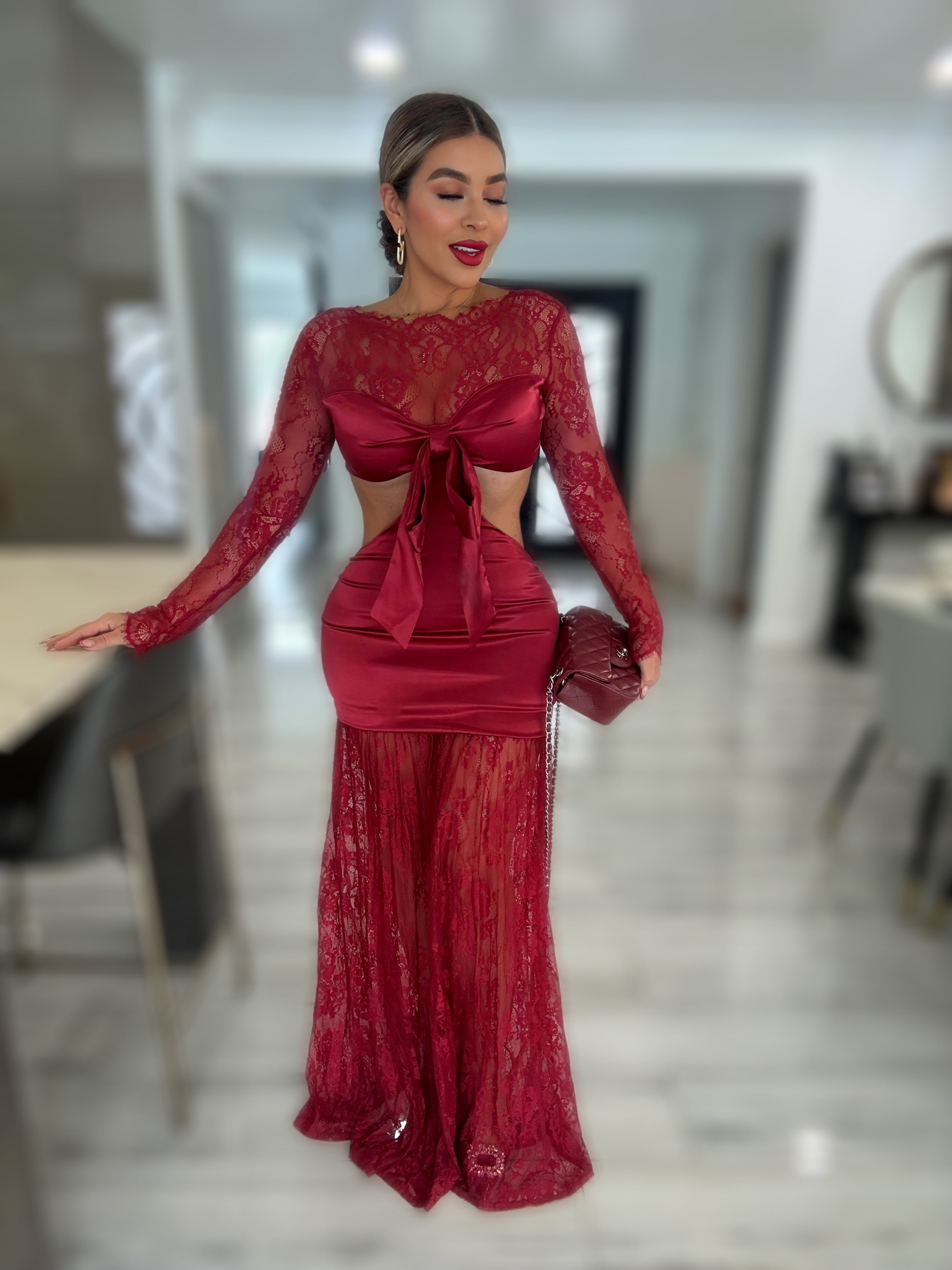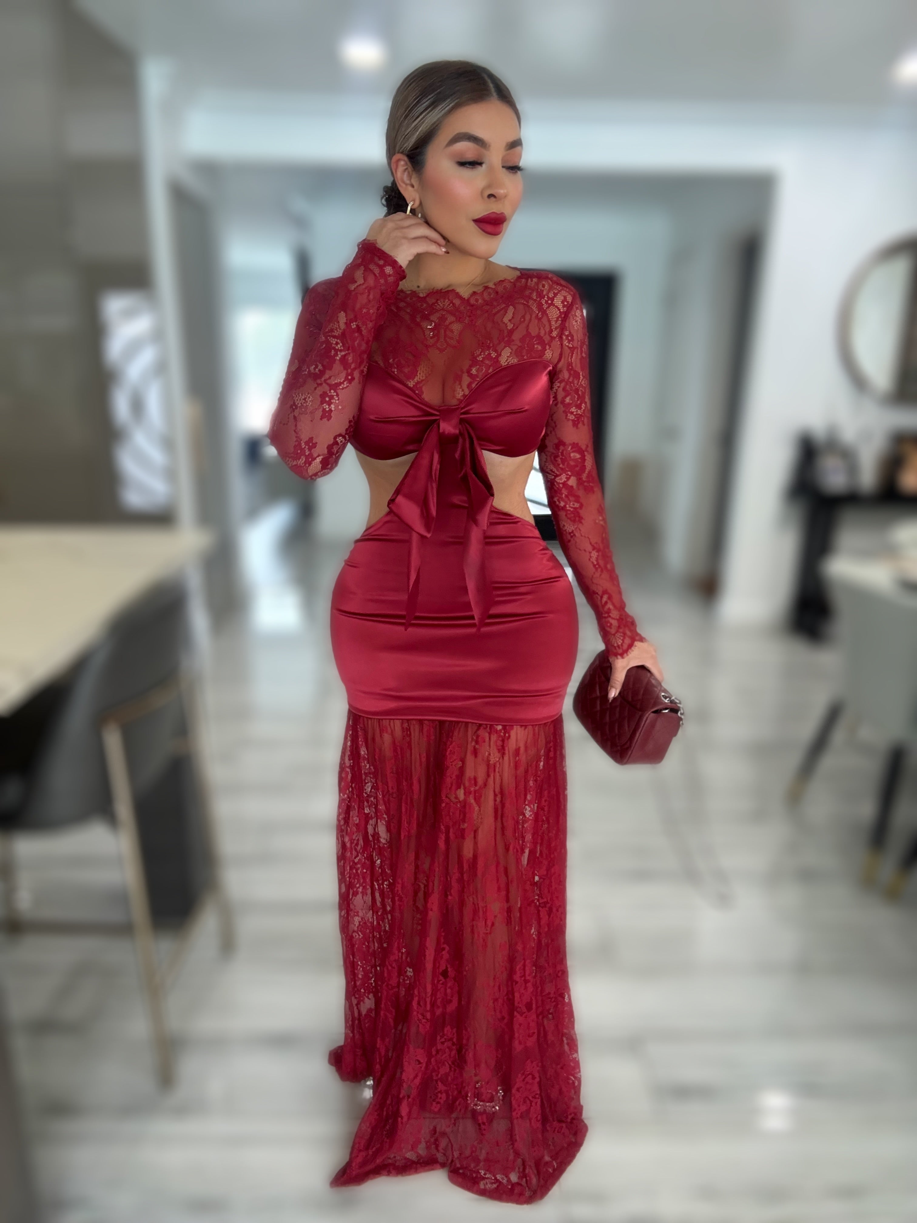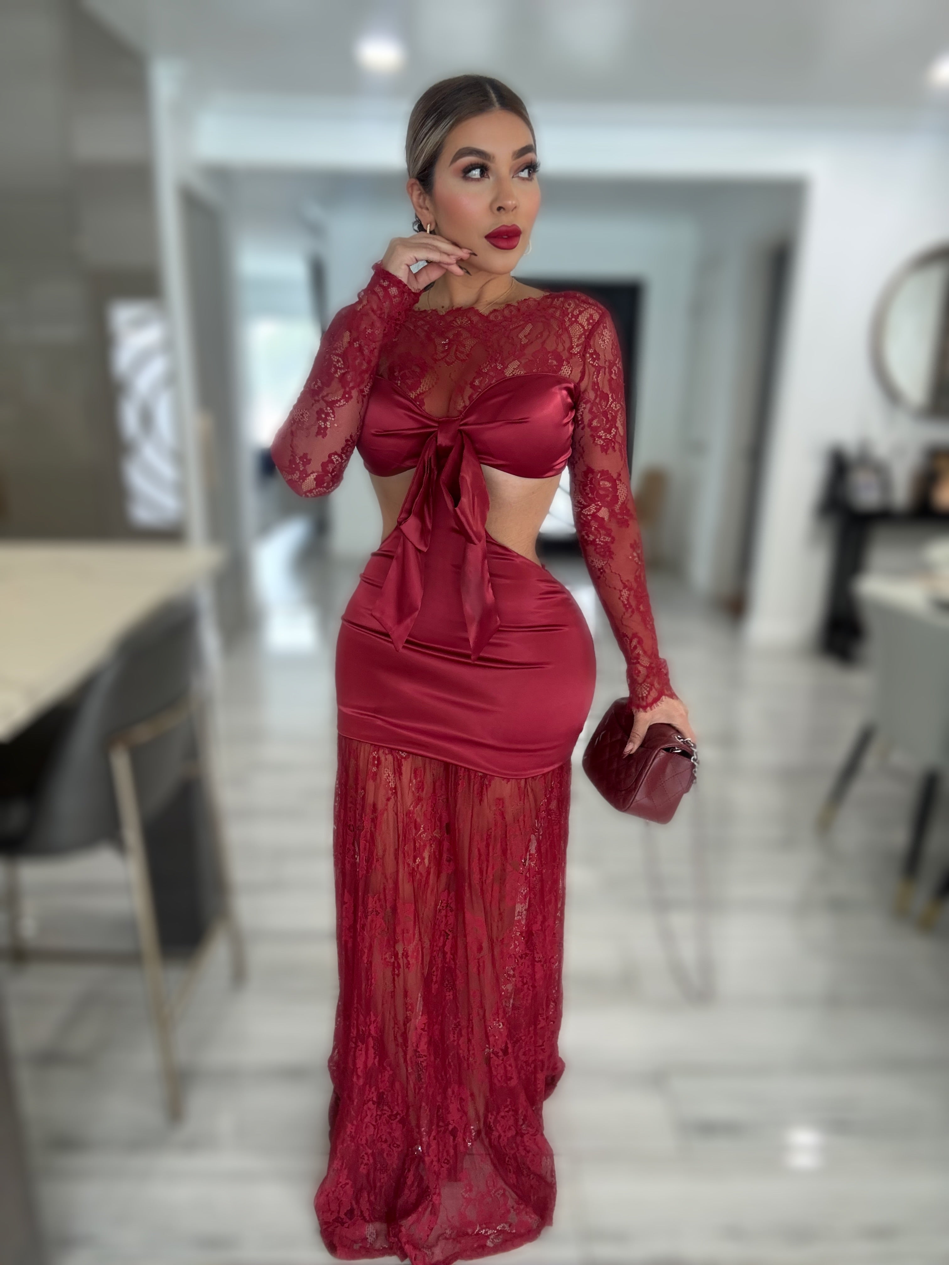 Details : Long sleeve satin lace maxi dress made from stretch material  model is wearing size small,model is 5.5 height , 38 in bust , 25 in waist and 42 in hips .