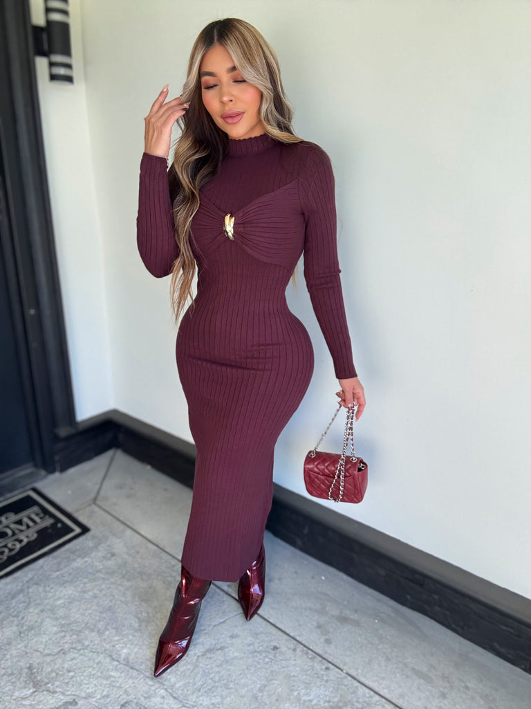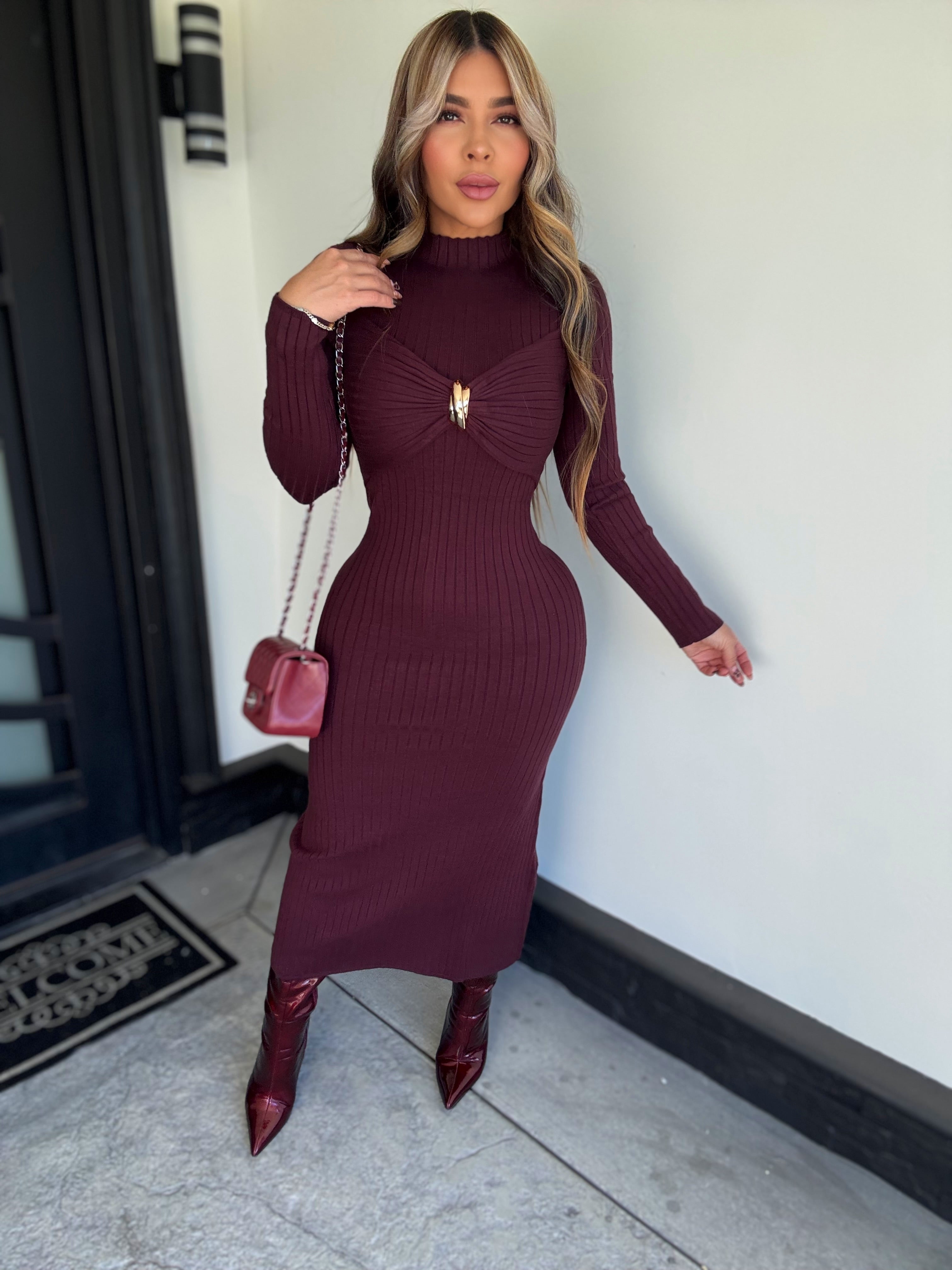 Details : Long sleeve sweater maxi dress made from stretch material model is wearing size small , model is 5.5 height , 38 in bust , 25 in waist and 42 in hips .