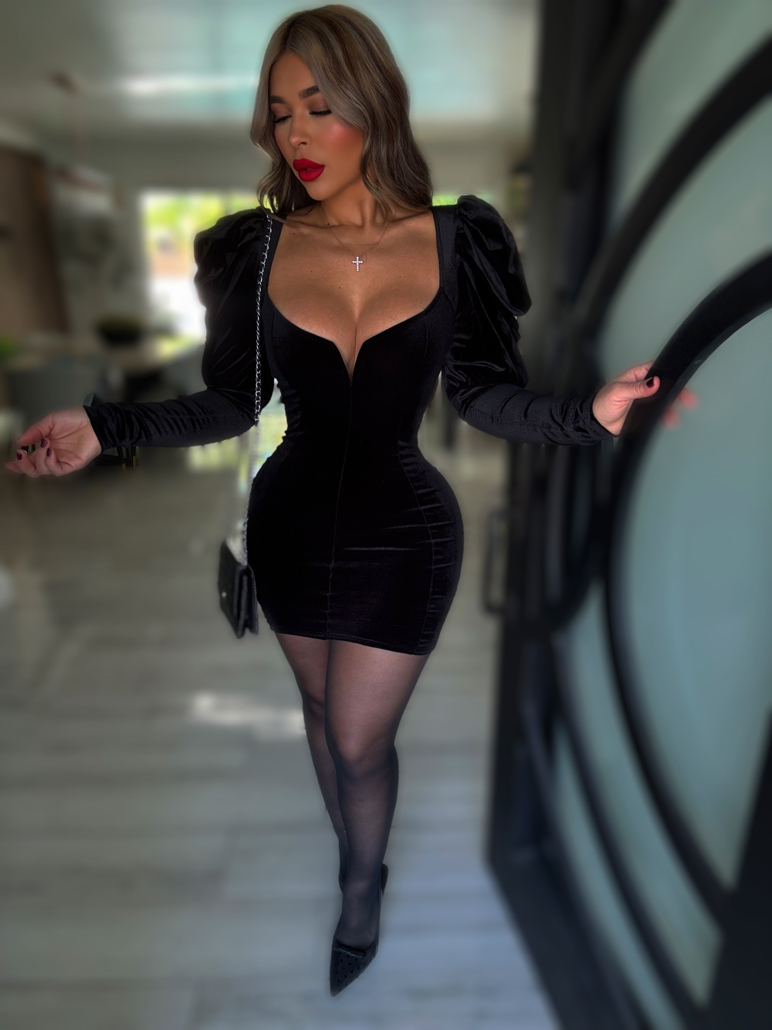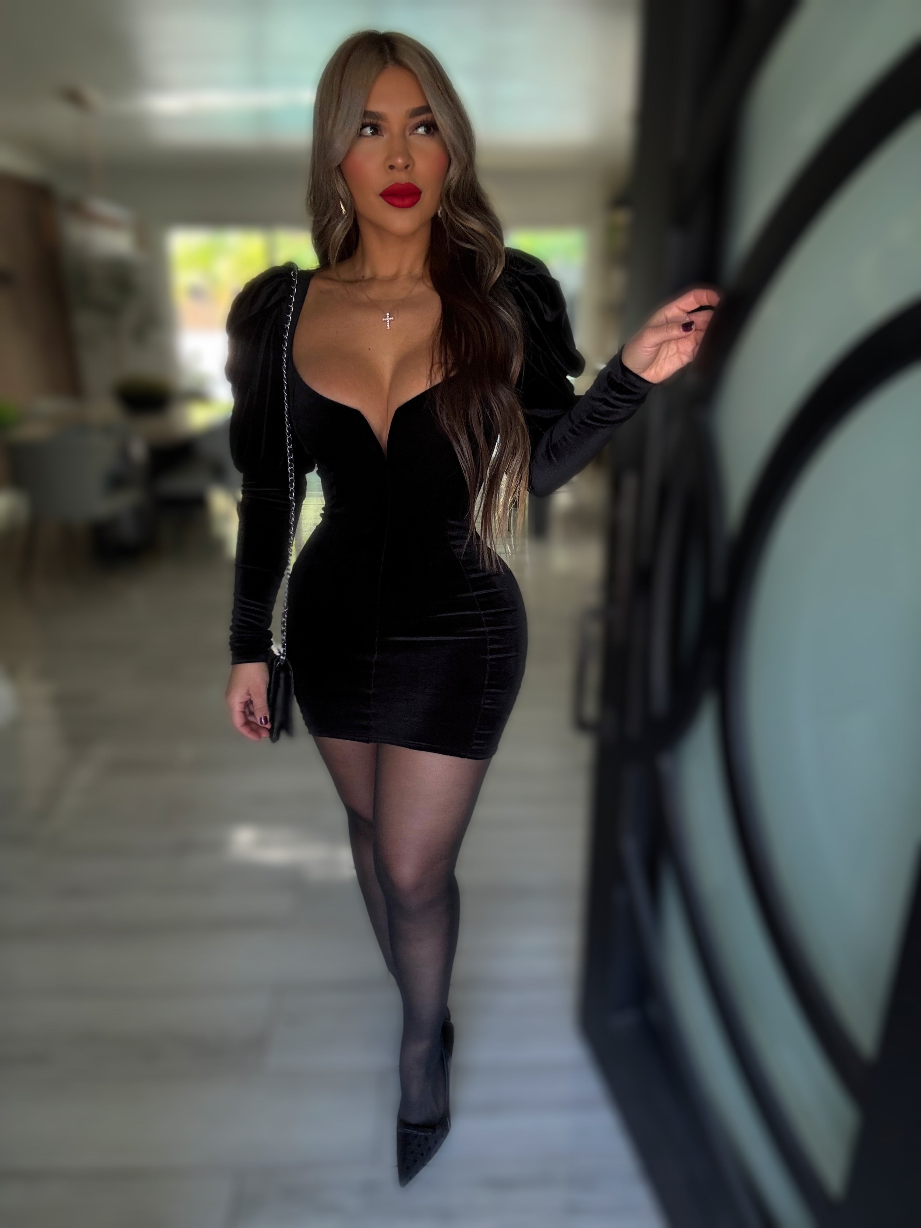 Details : Long sleeve mini dress made velvet stretch material model is wearing size small , model is 5.5 height , 38 in bust , 25 in waist and 42 in hips .