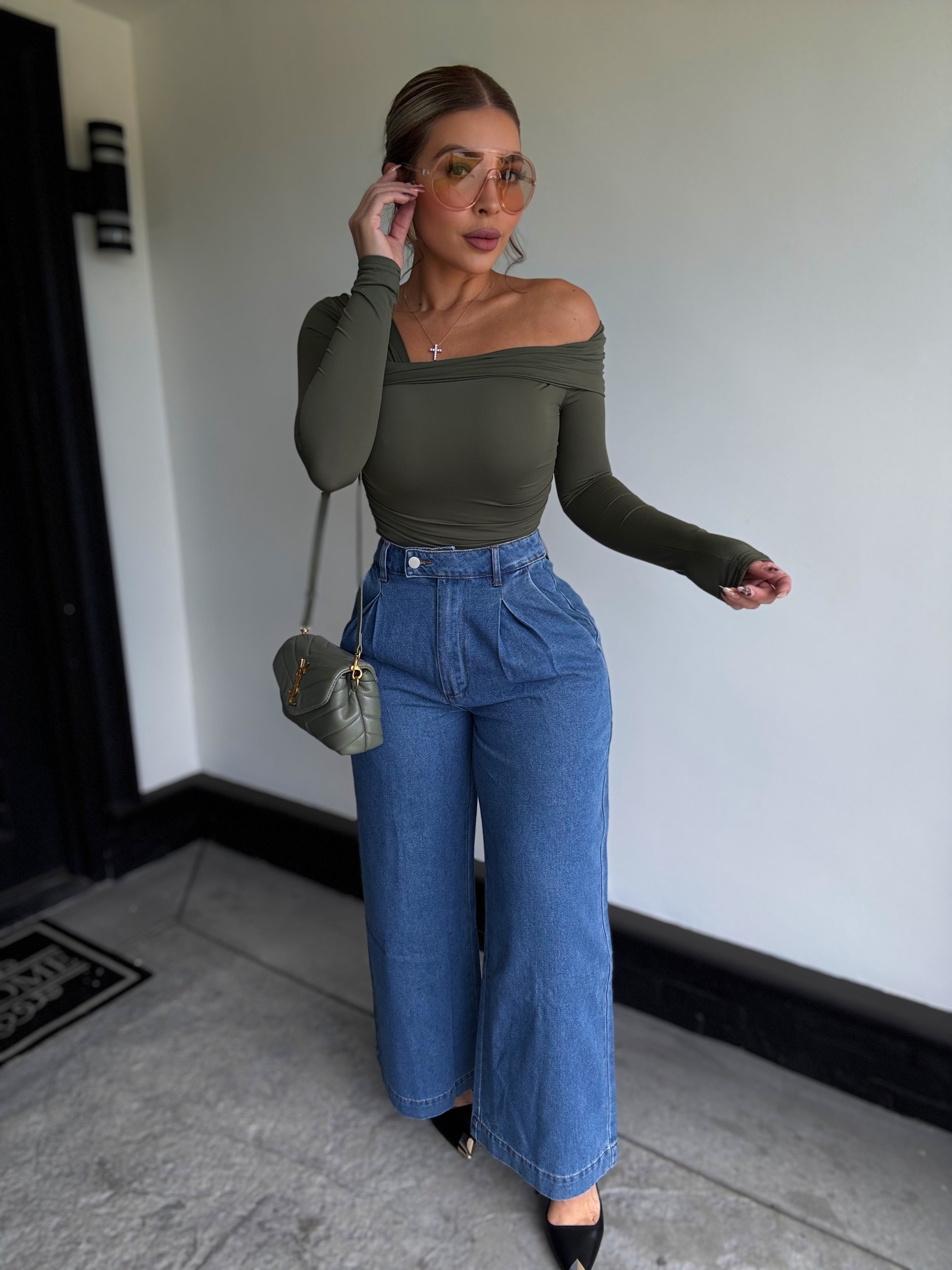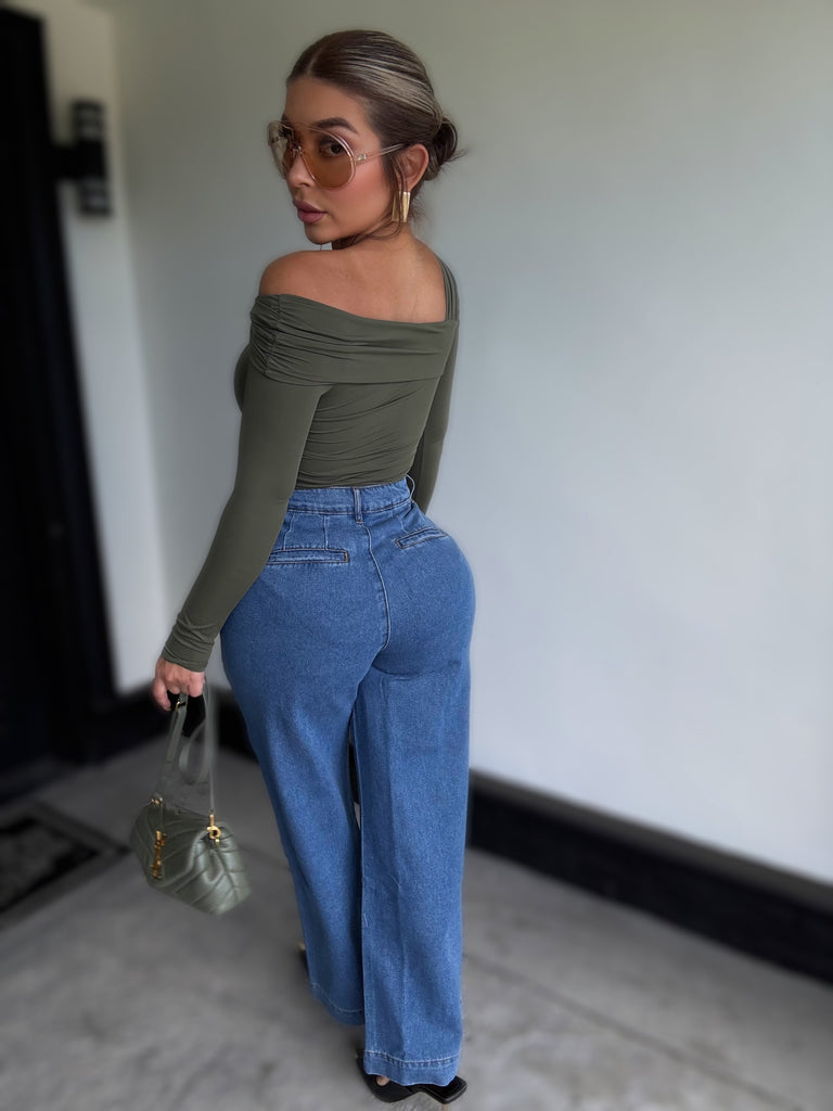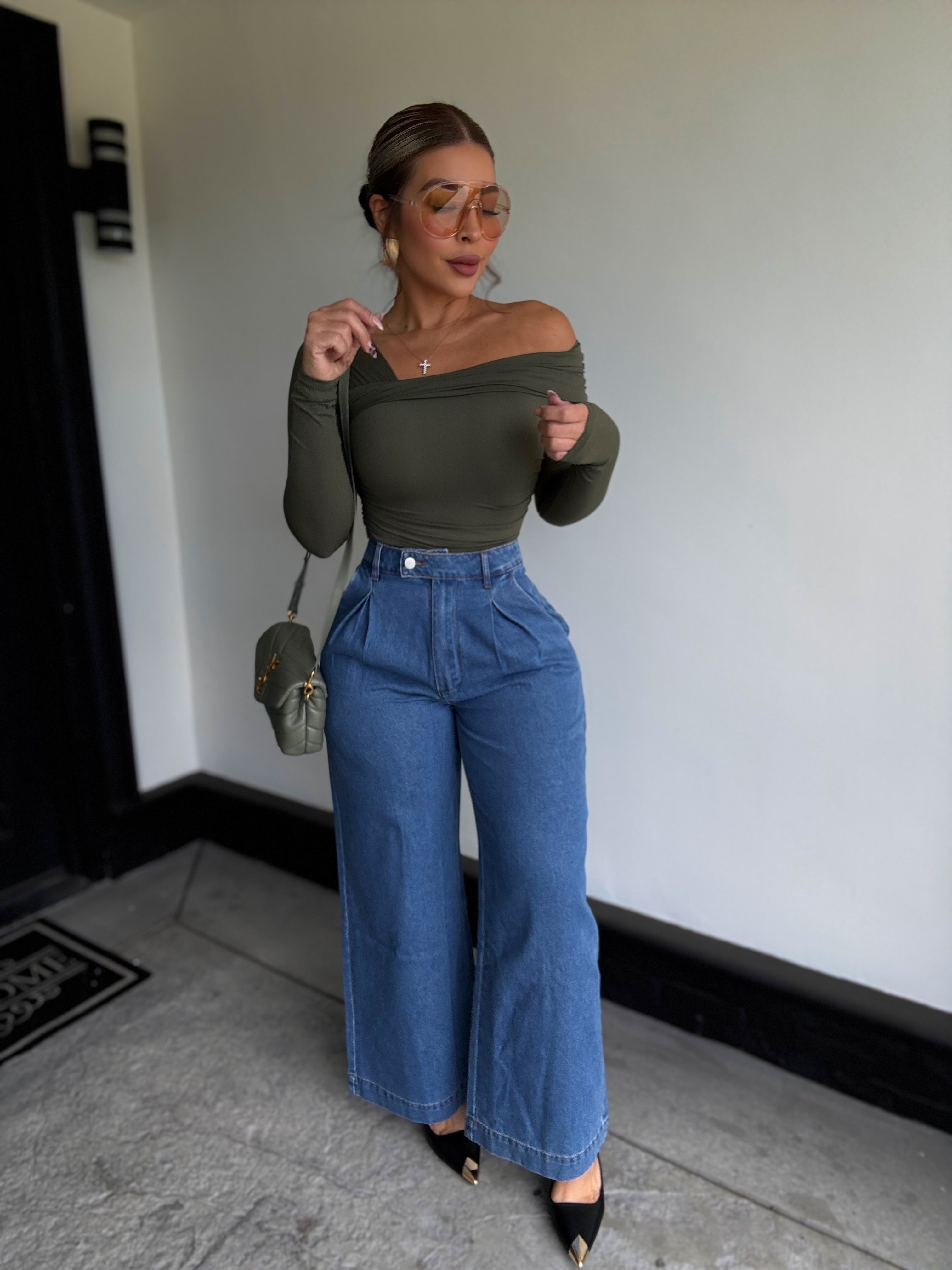 Details : High waisted pleated wide leg jeans made from non stretch material model is wearing size small, model is 5.5 height , 25 in waist and 42 in hips .