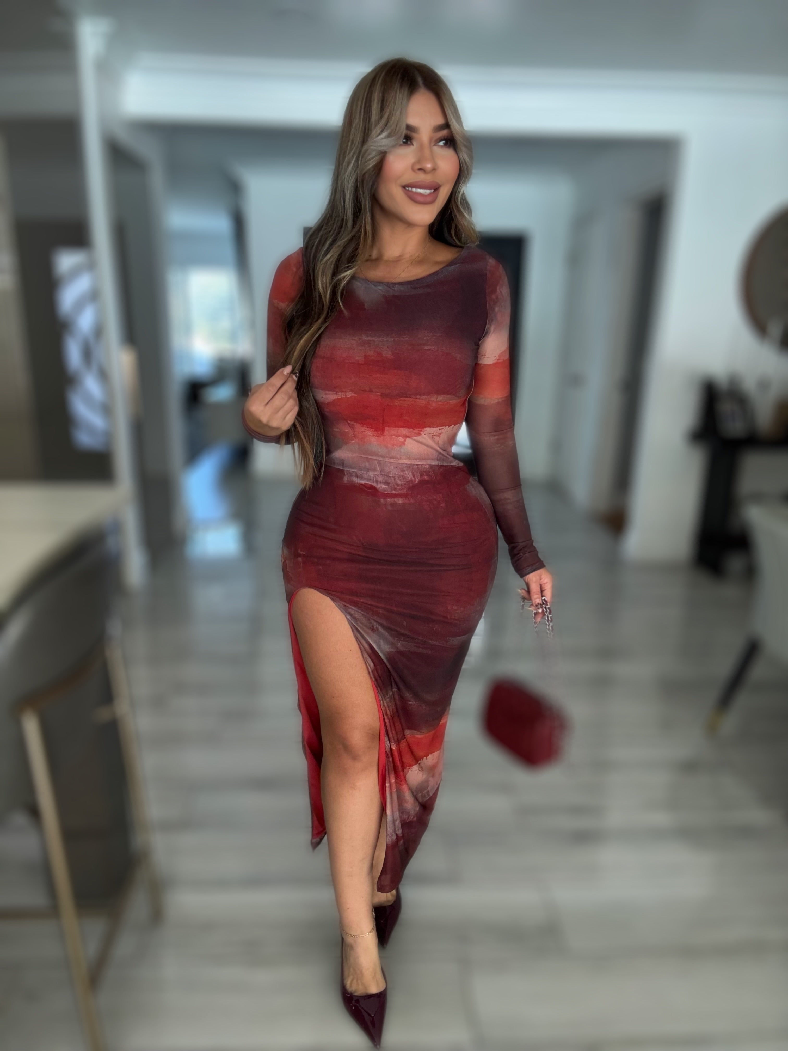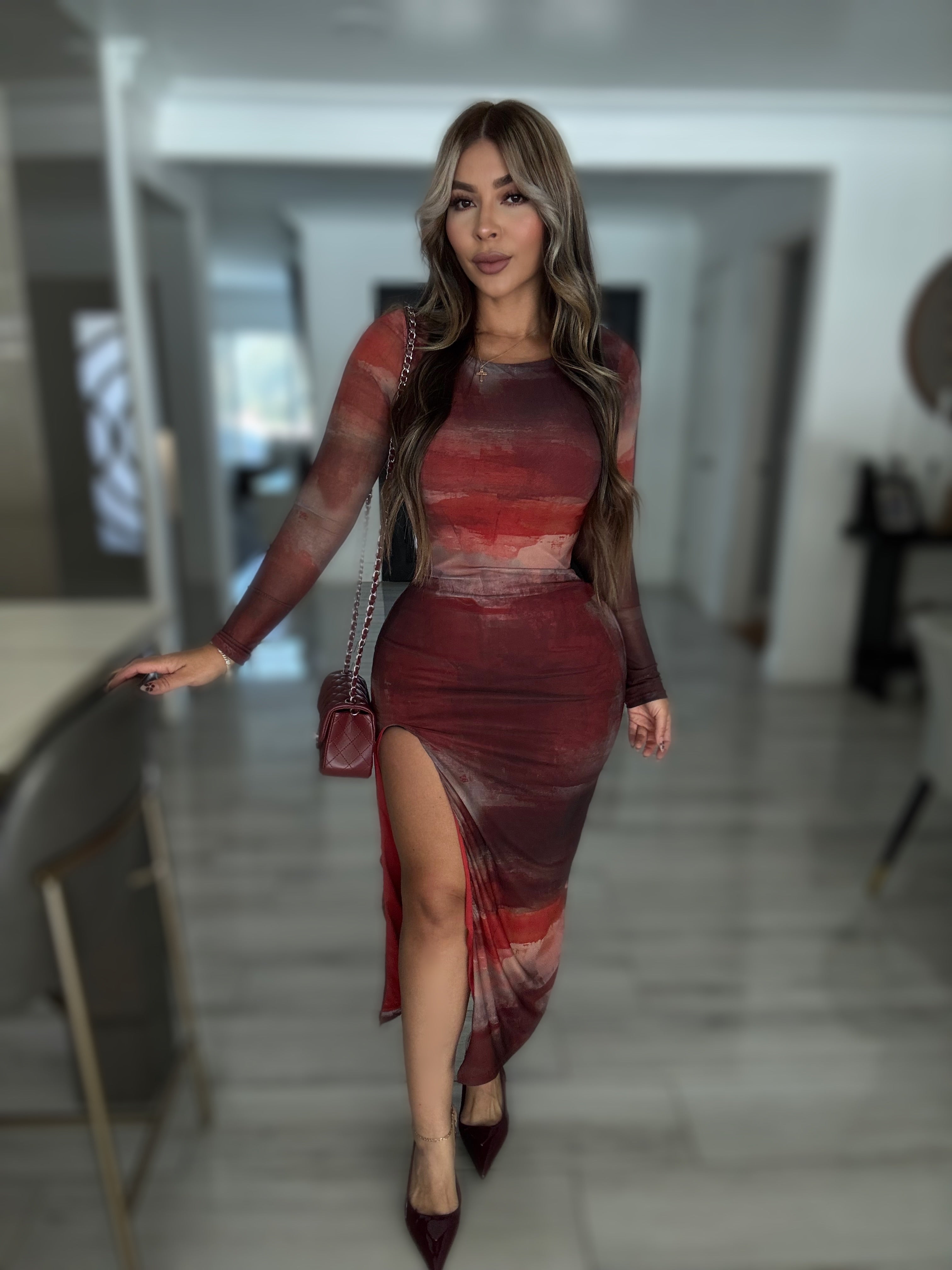 Details : Long sleeve double layered maxi dress made from mesh stretch material  model is wearing size small , model is 5.5 height , 38 in bust , 25 in waist and 42 in hips .