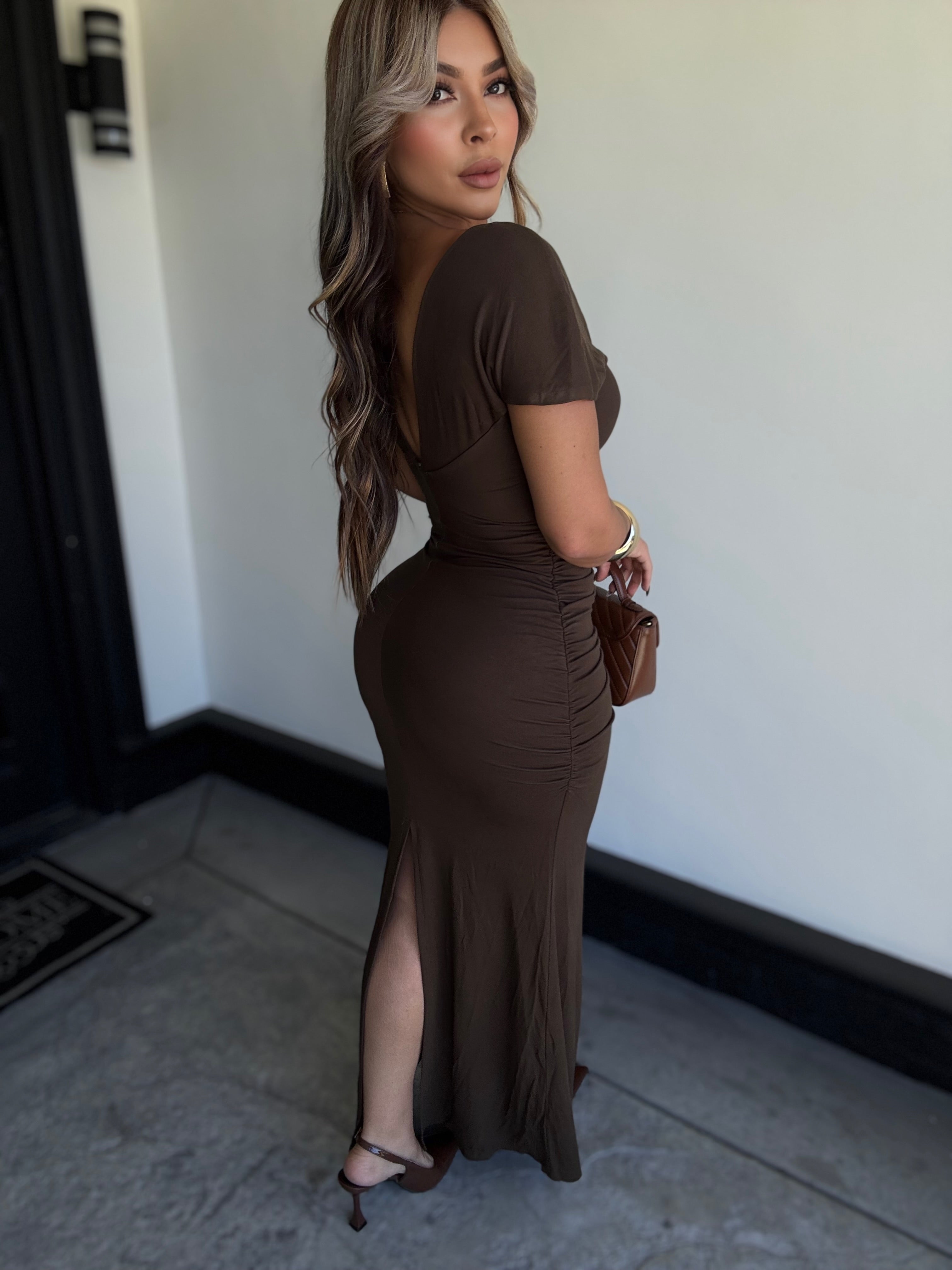 Details : Short sleeve maxi dress made from stretch material model is wearing size small , model is 5.5 height , 38 in bust , 25 in waist and 42 in hips .