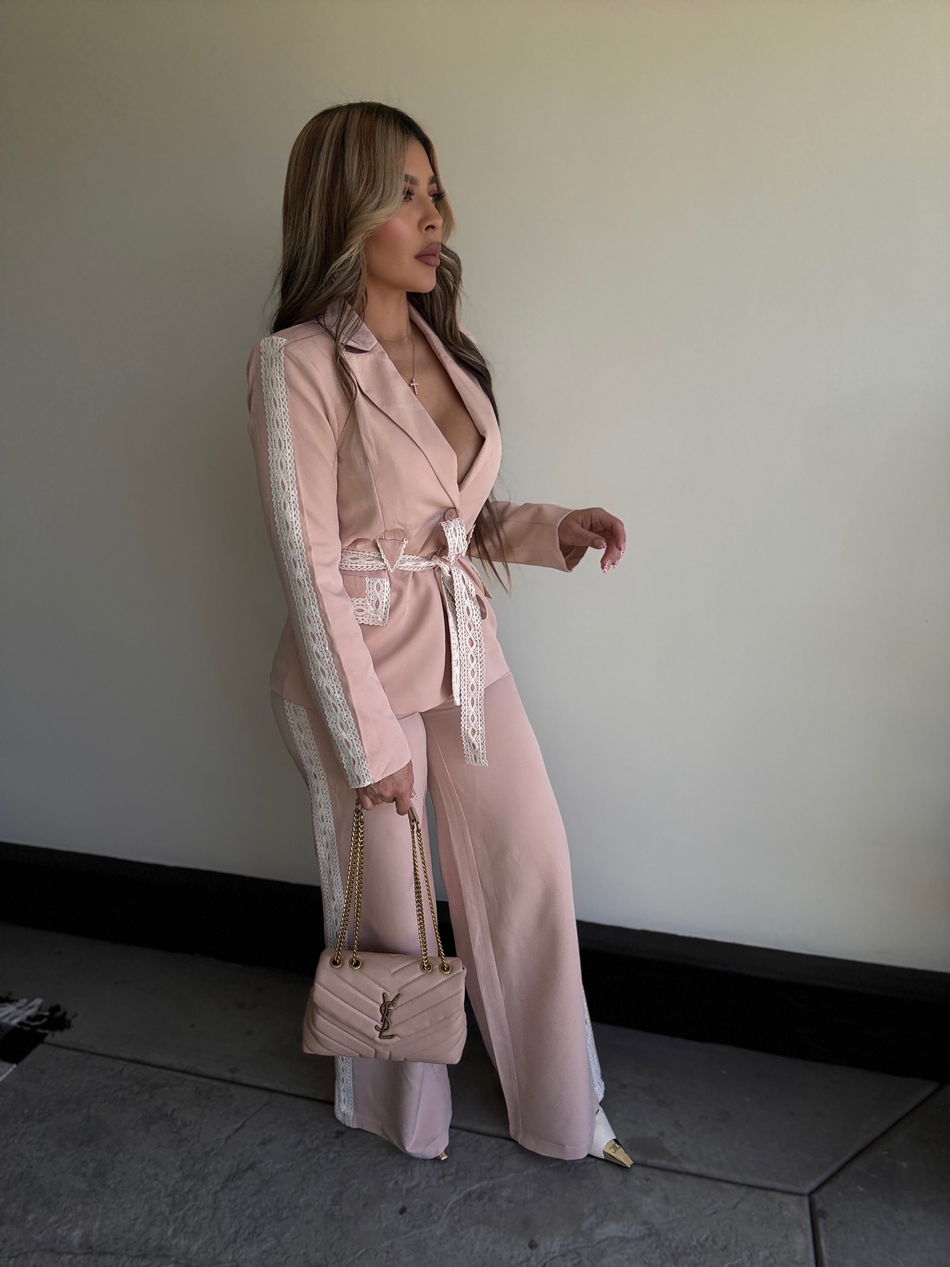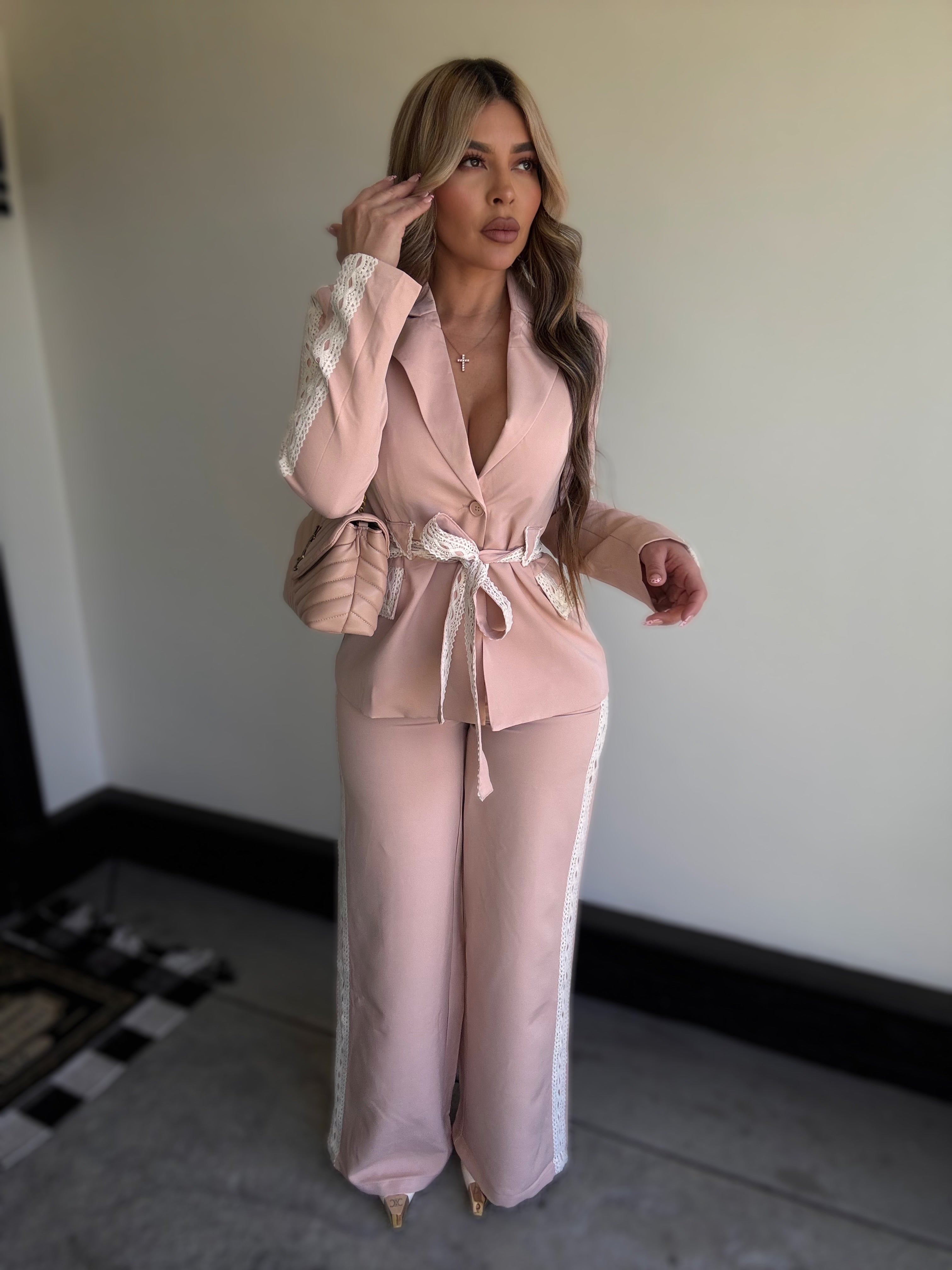 Details: Long sleeve blazer with pants set made from non stretch material , very comfortable model is wearing size small ,model is 5.5 height , 38 in bust , 24 in waist and 42 in hips .