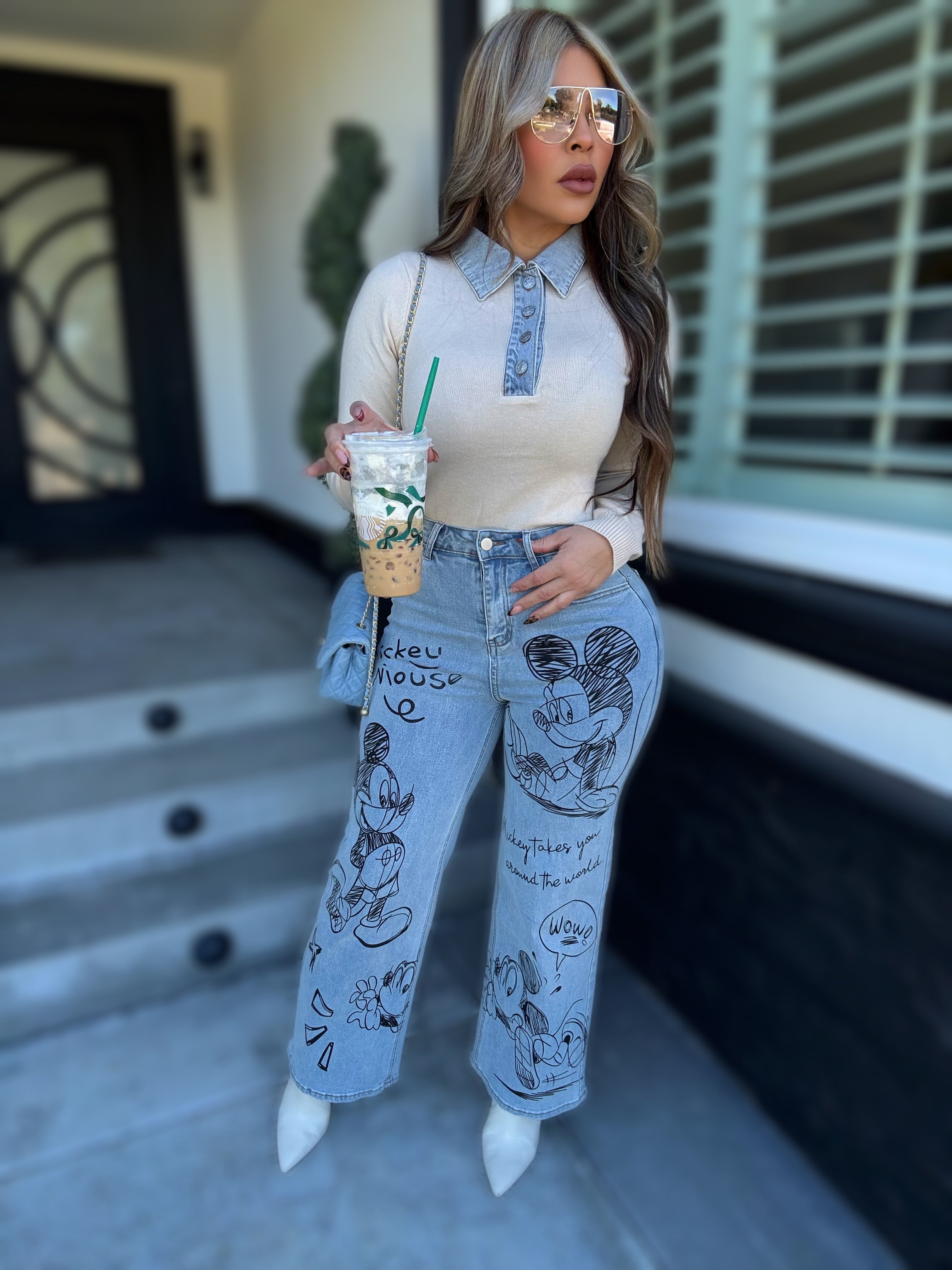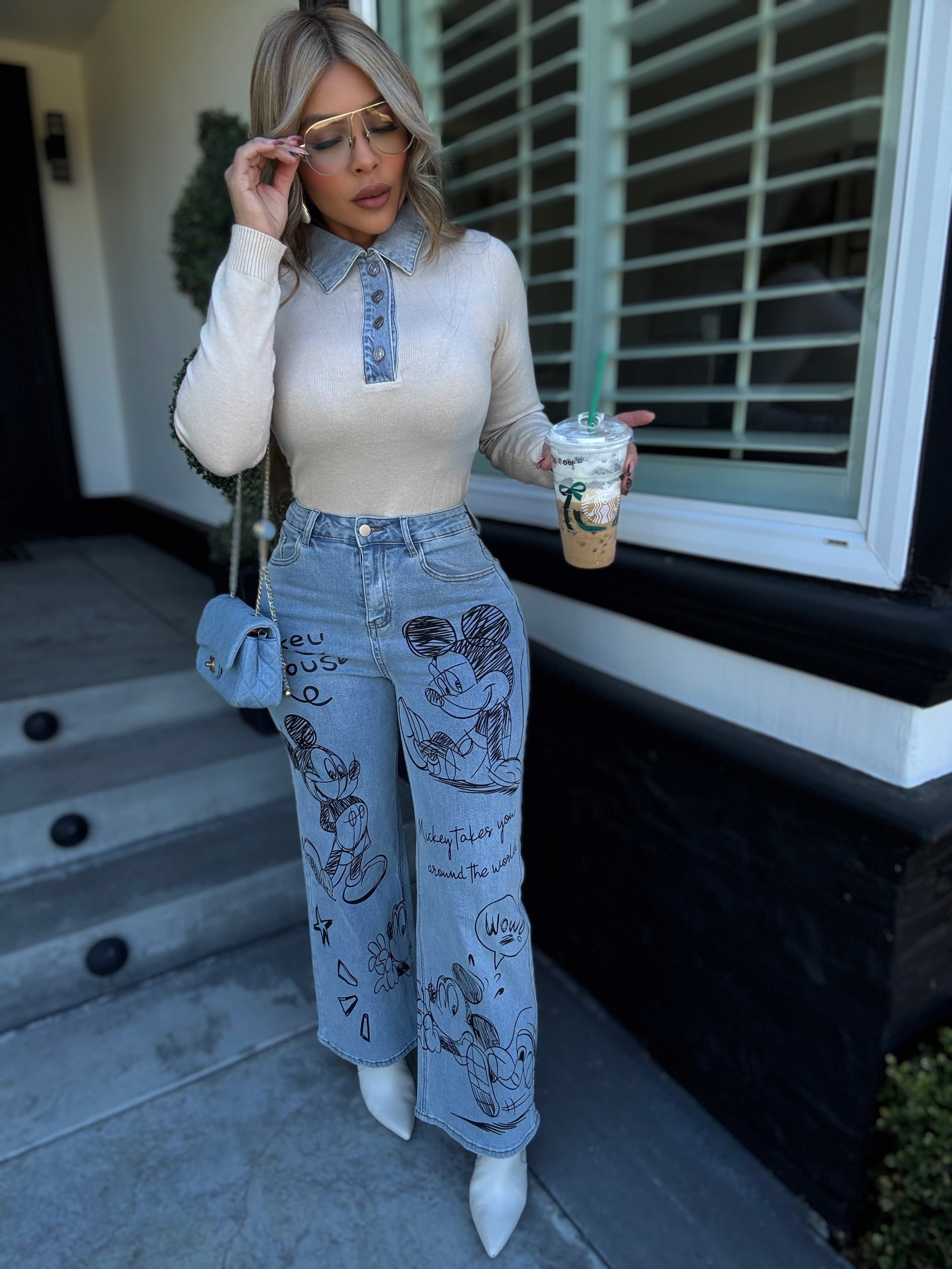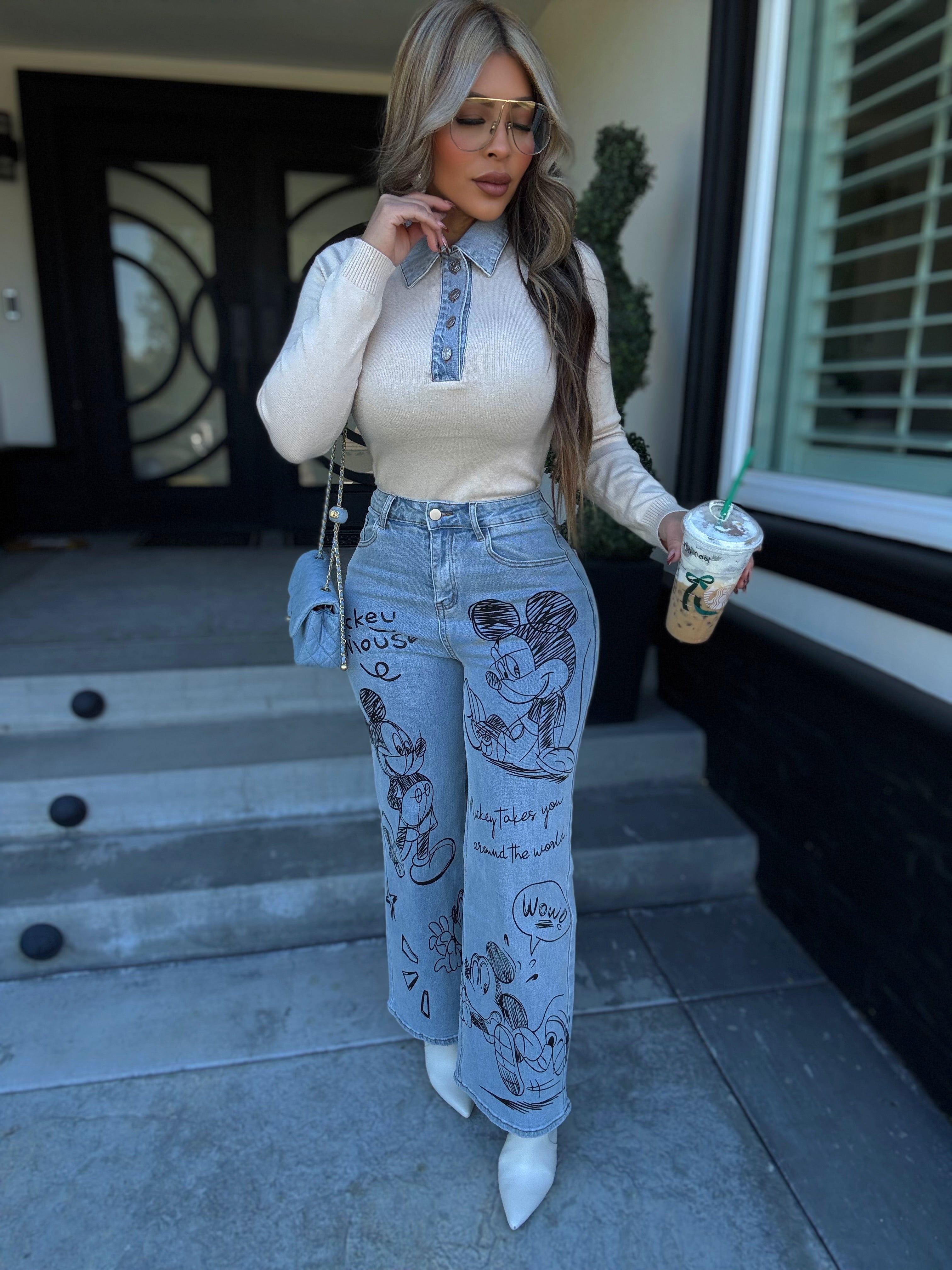 Details: Long sleeve knitted top with denim detail  made from stretch material model is wearing size small , model is 5.5 height , 38 in bust , 25 in waist.