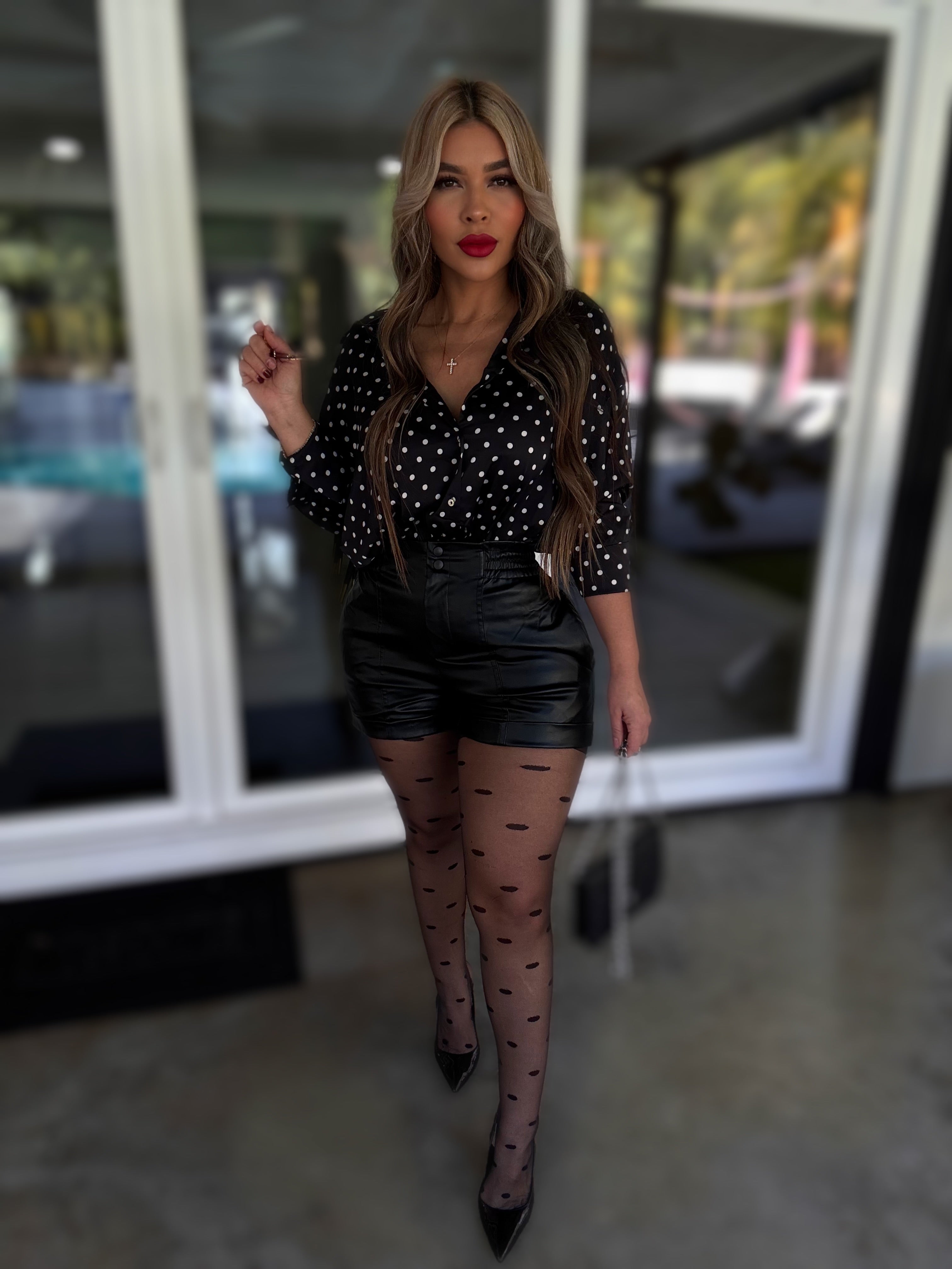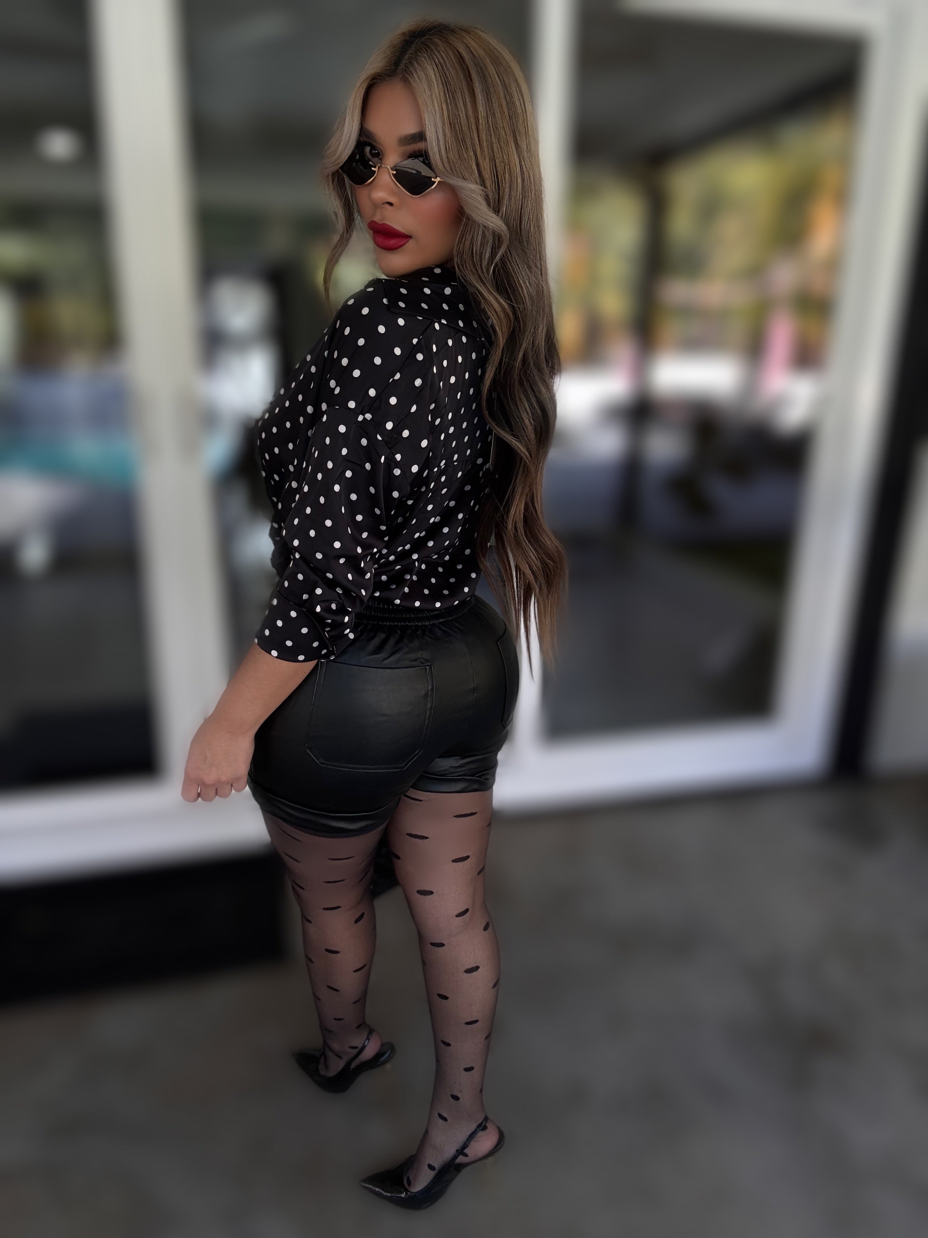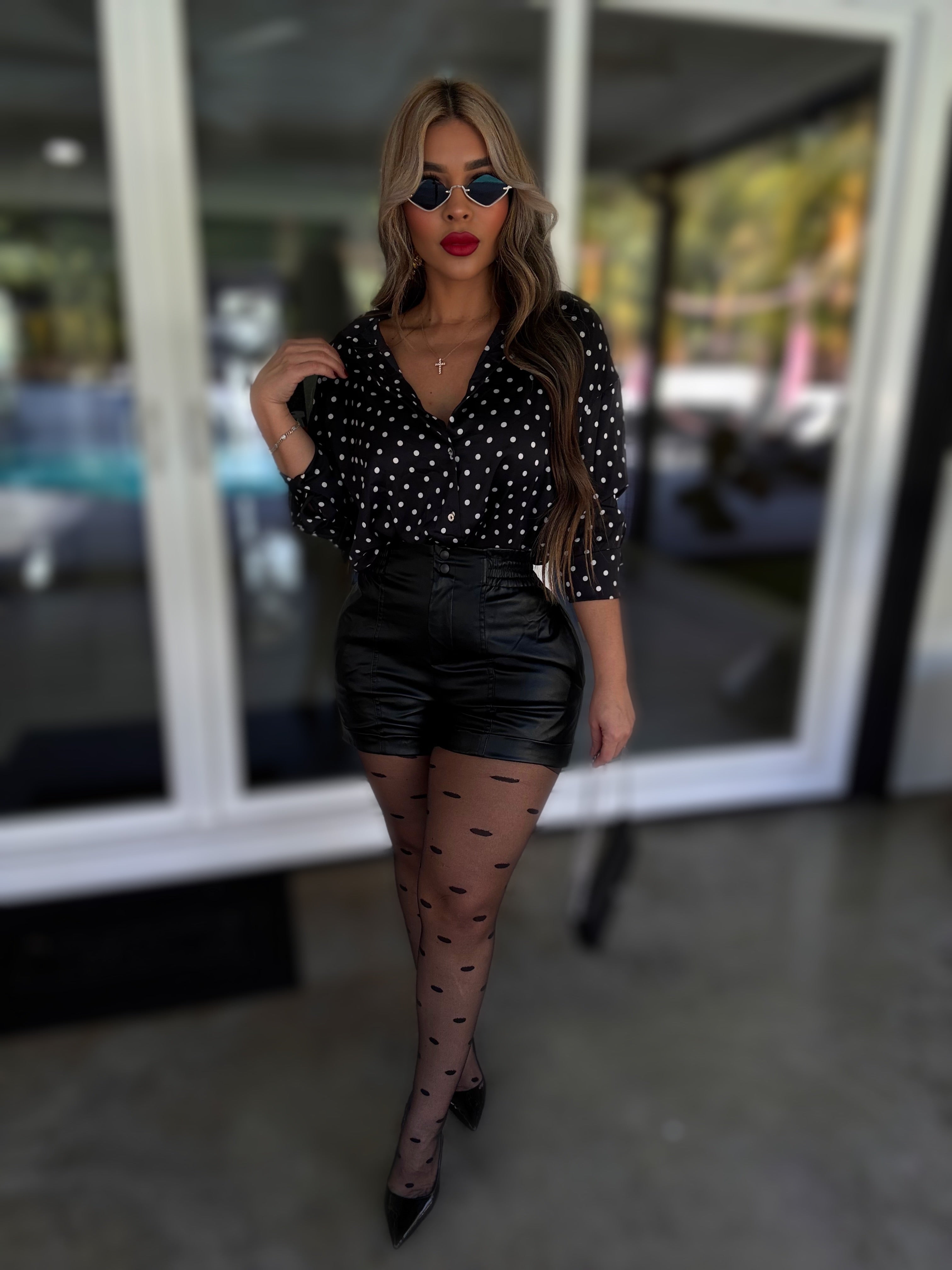 Details : Long sleeve button down top with stretch model is wearing size small , model is 5.5 height , 38 in bust , 25 in waist .