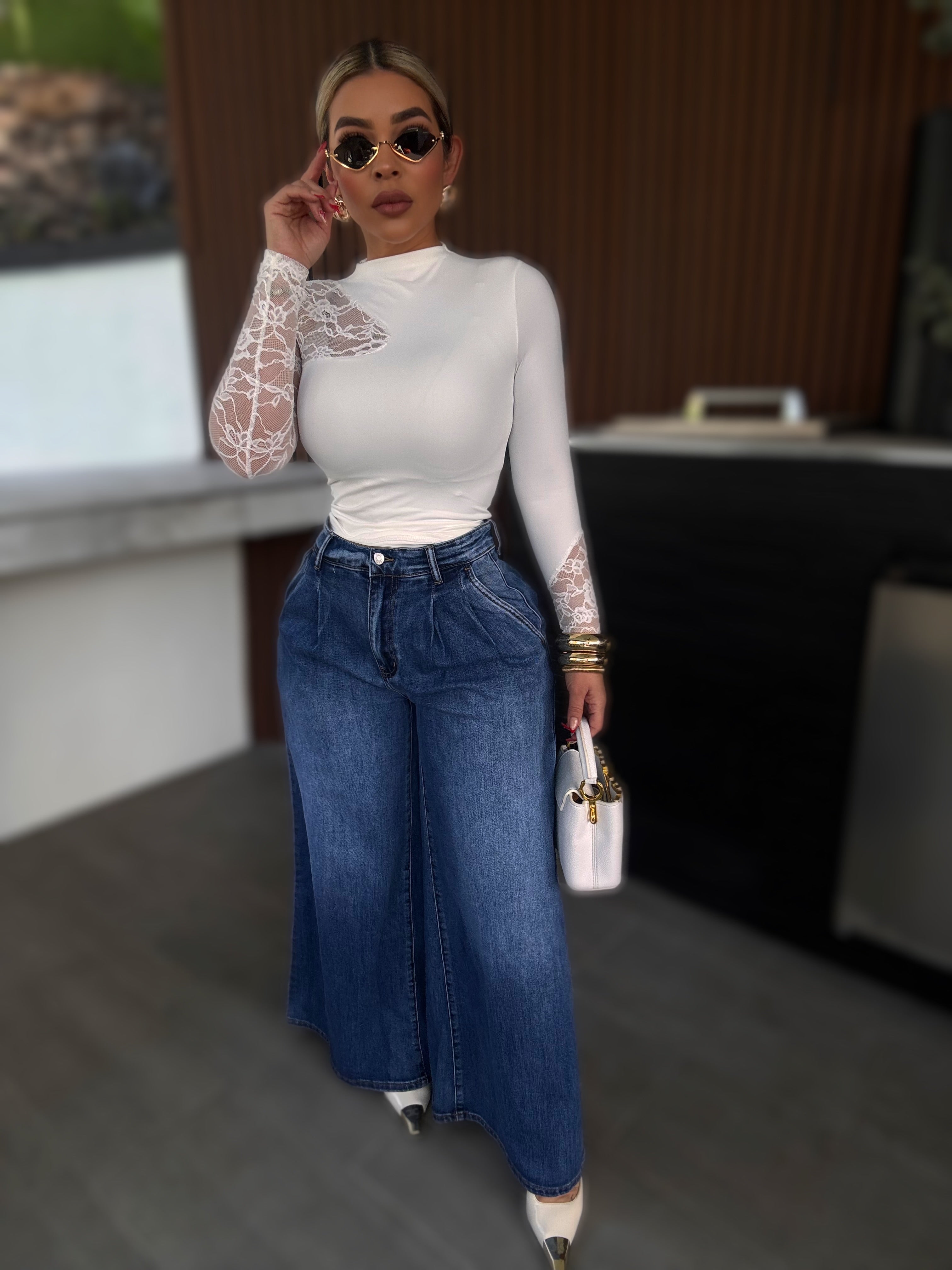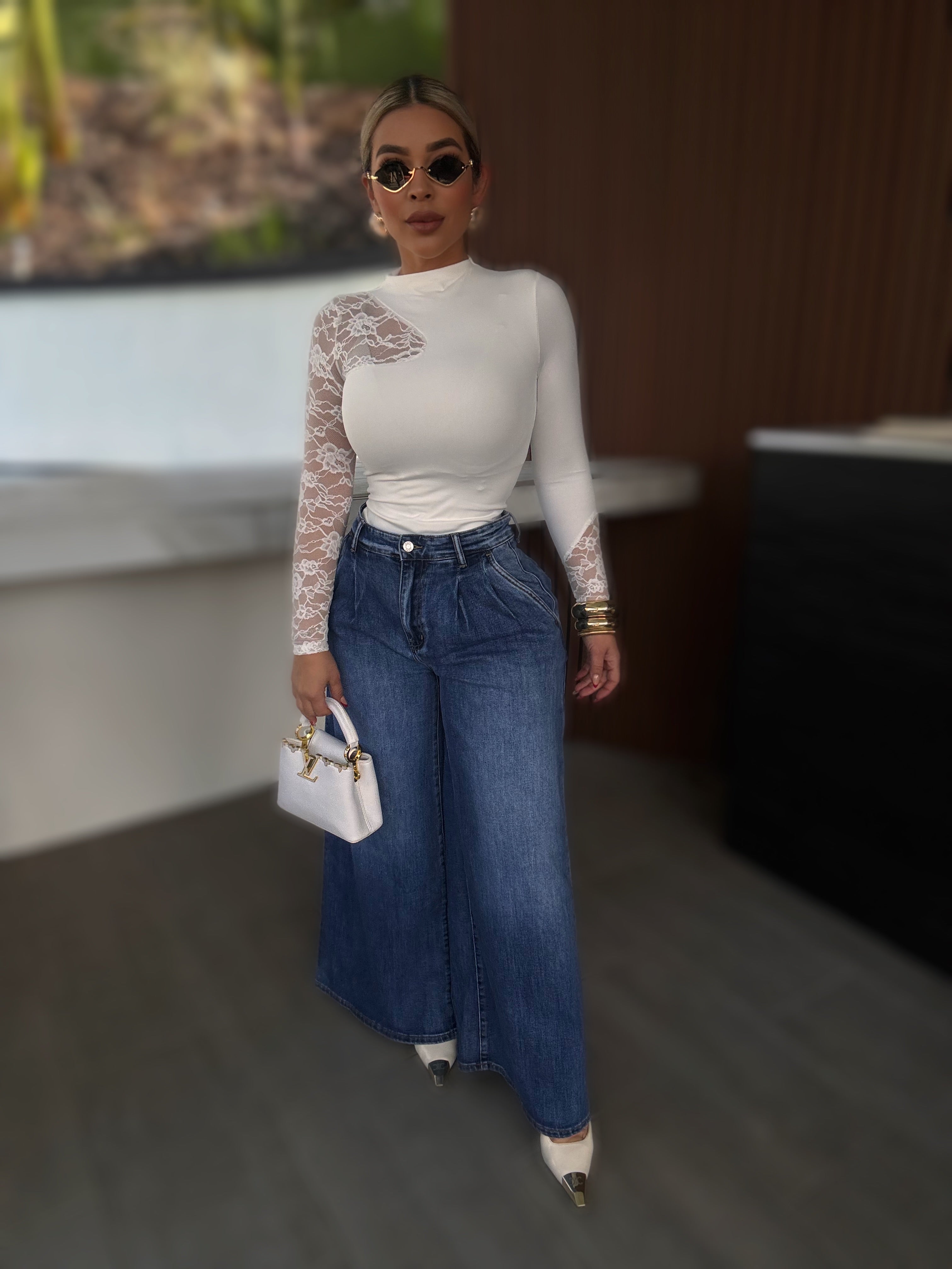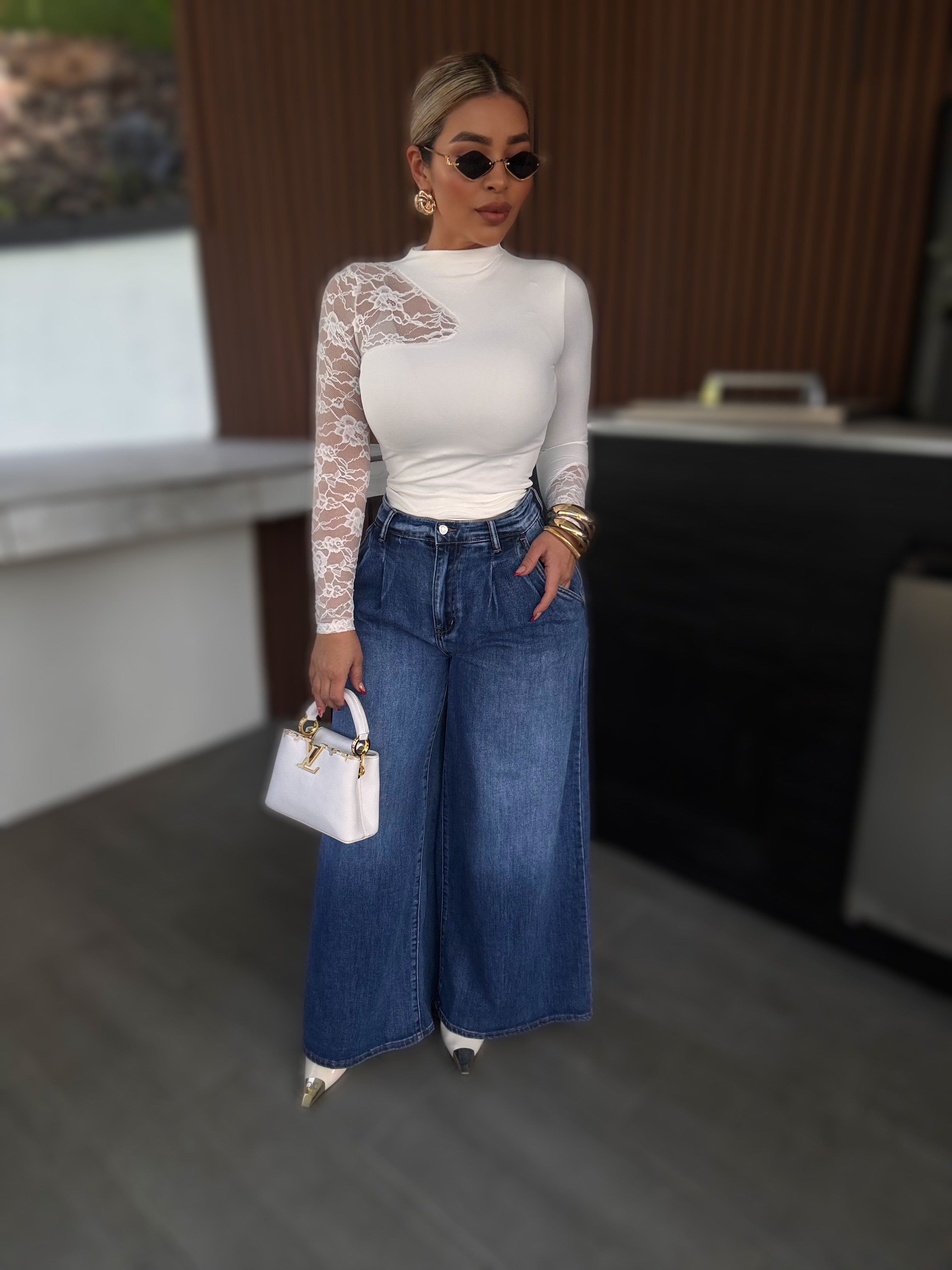 Details : Long sleeve lace top detail with stretch model is wearing size small , model is 5.5 height , 38 in bust , 25 in waist .