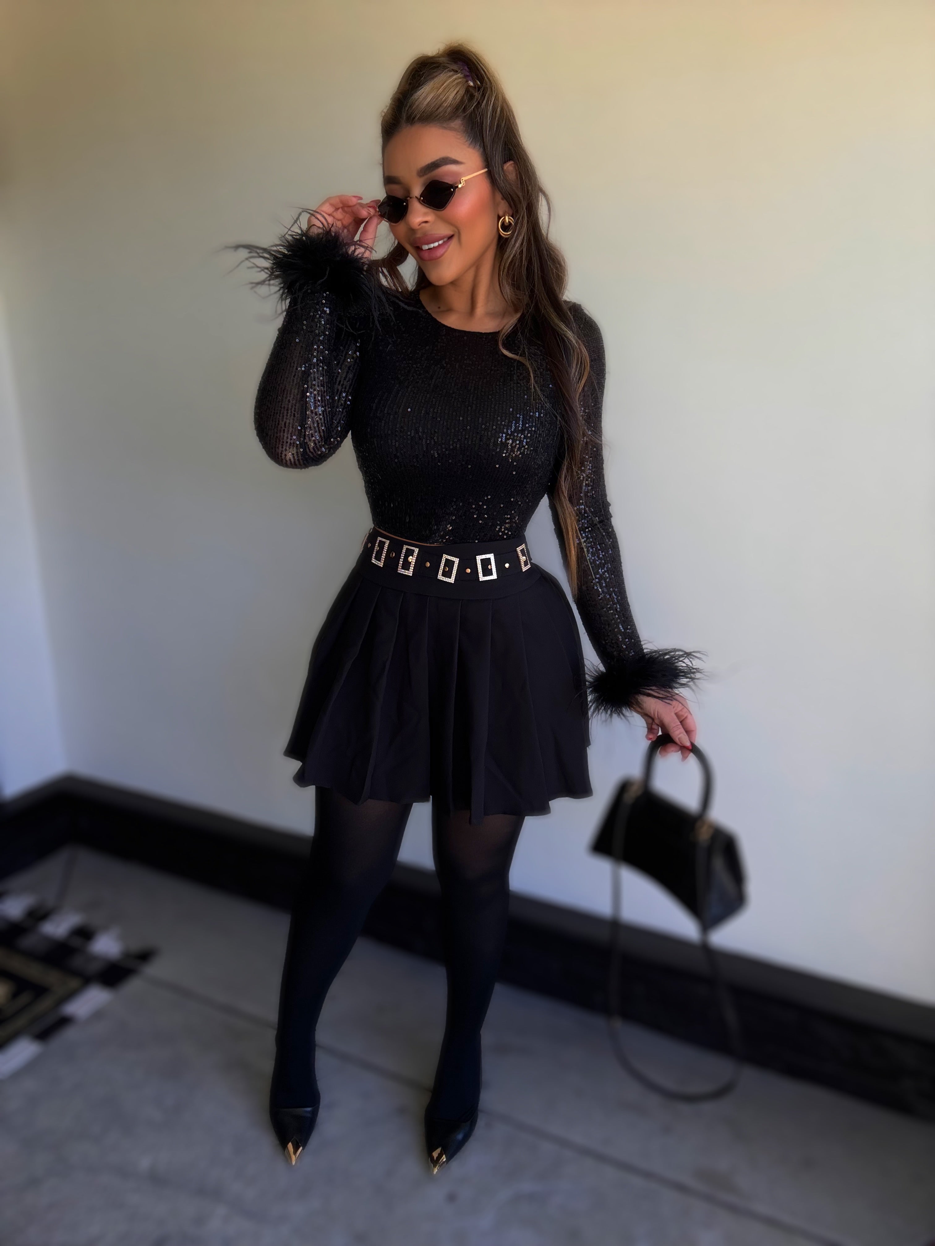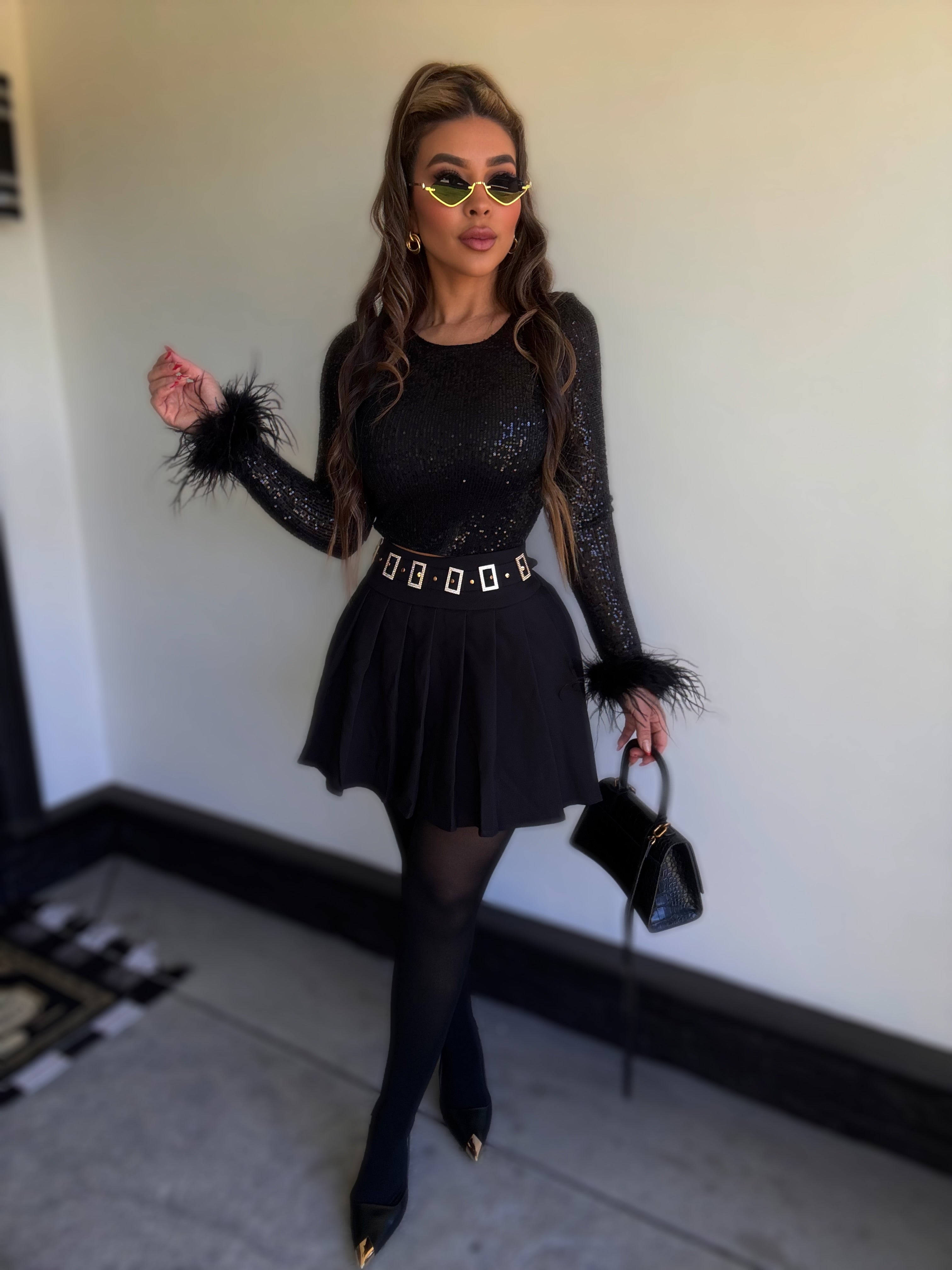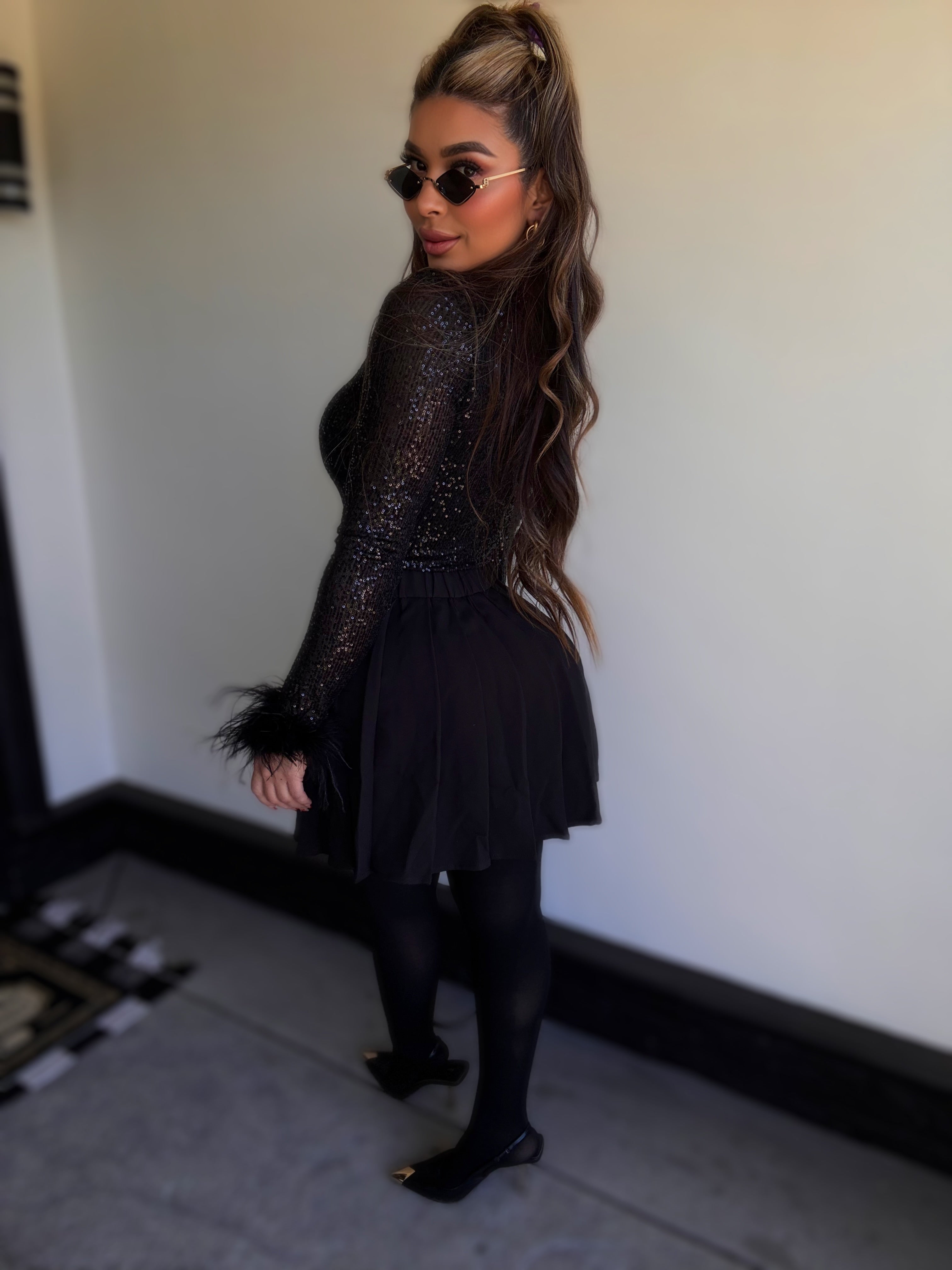 Details : Long sleeve sequins top with stretch model is wearing size small , model is 5.5 height , 38 in bust , 25 in waist .