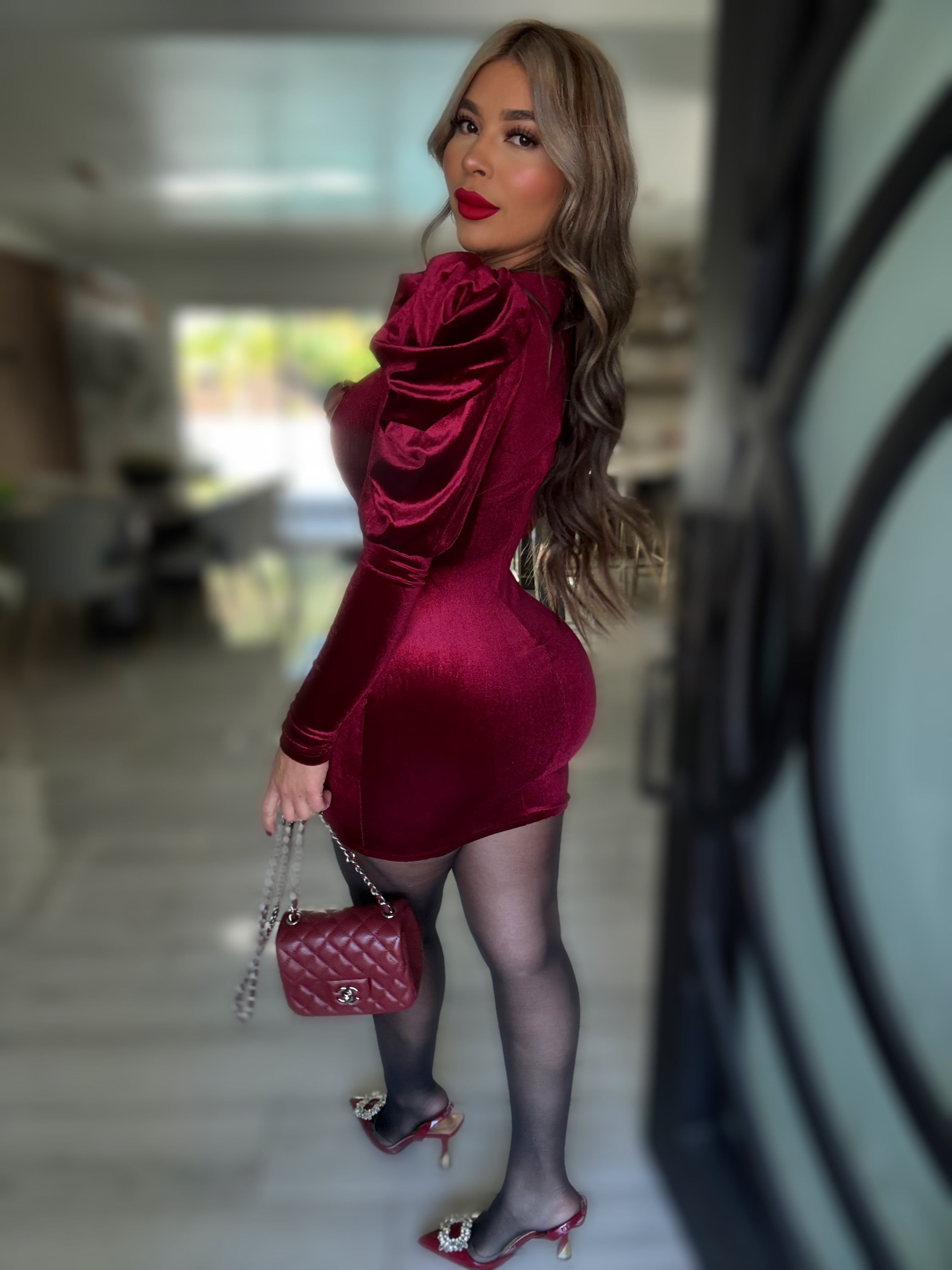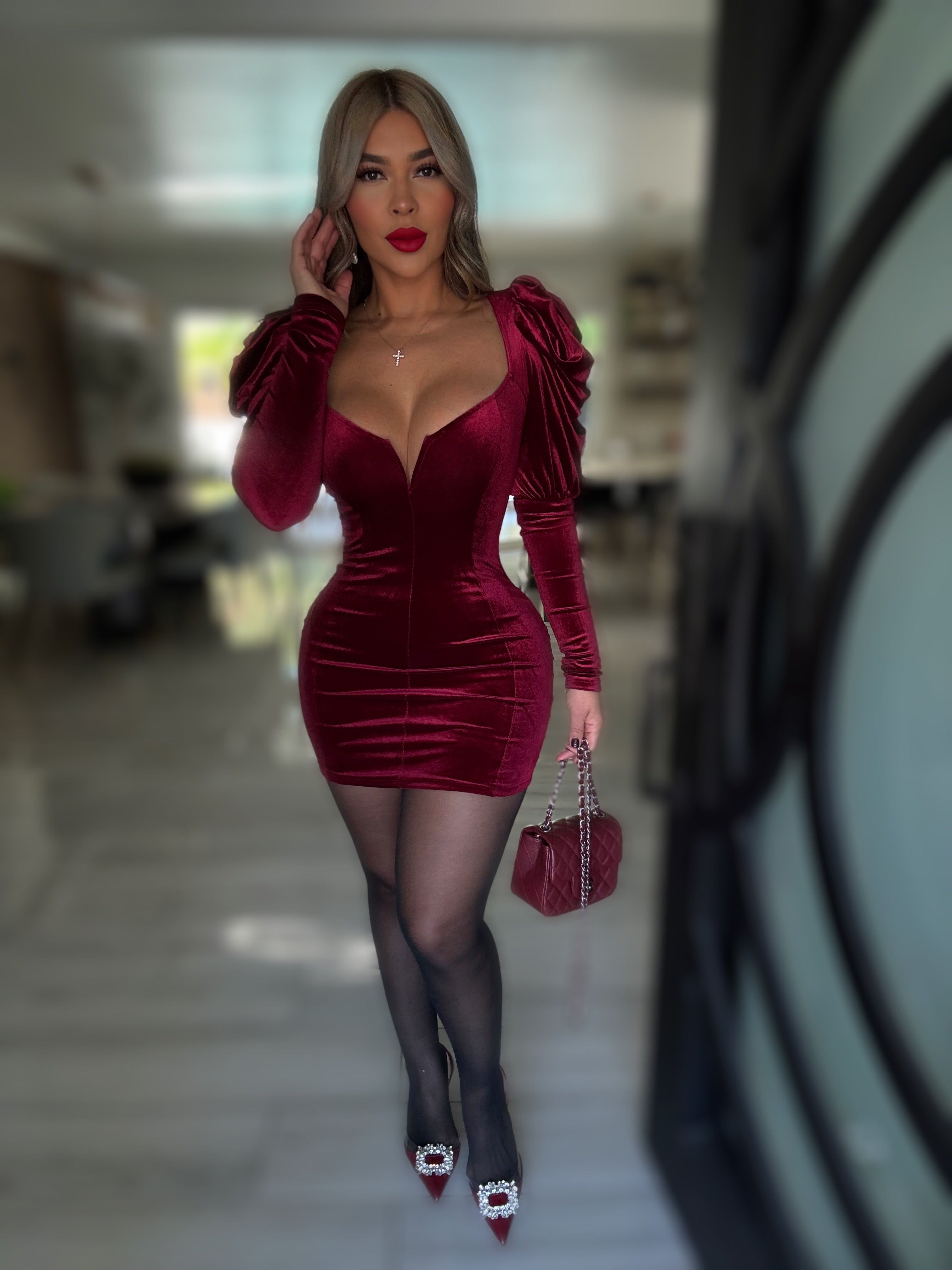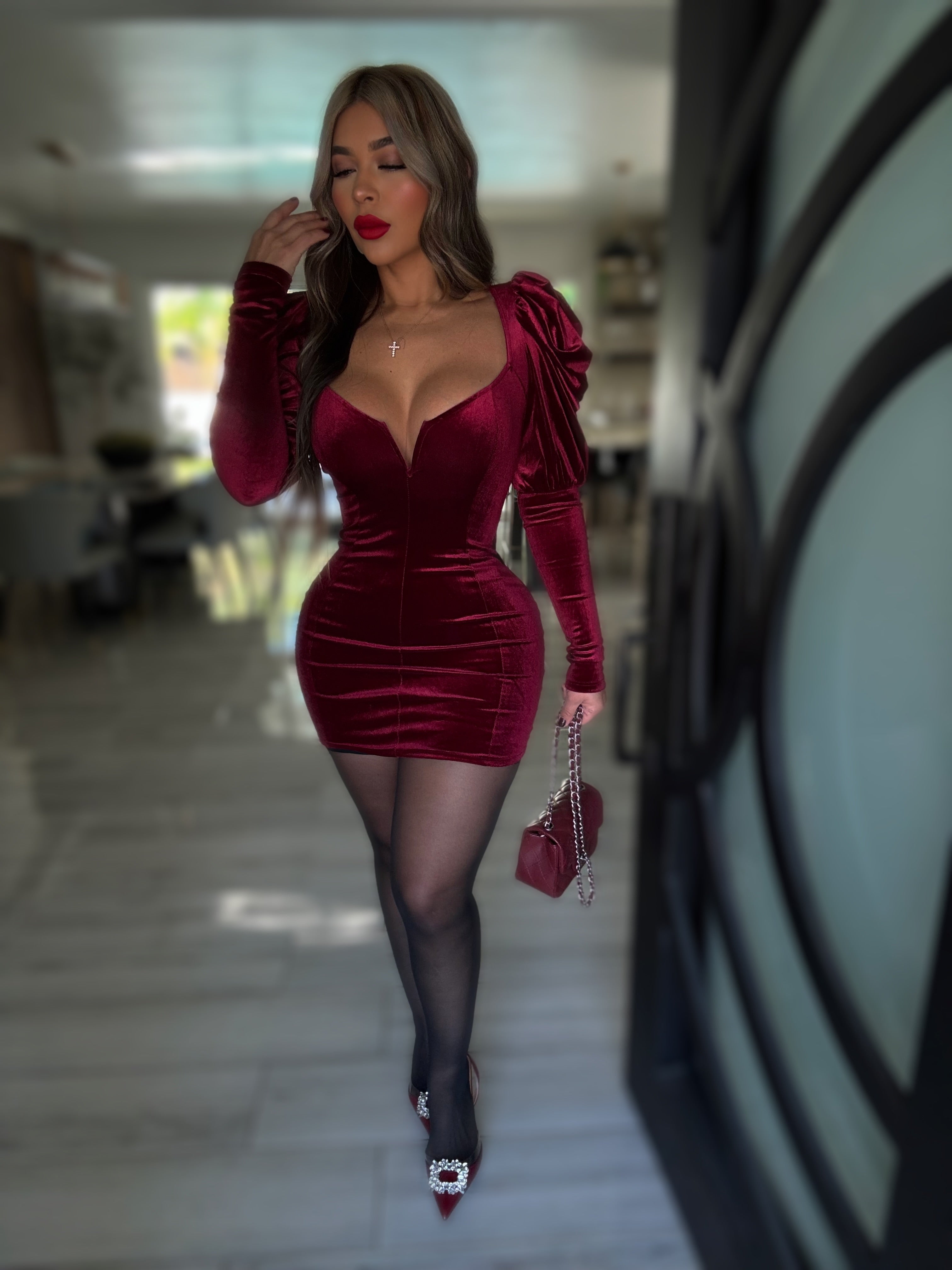 Details : Long sleeve mini  dress made velvet  stretch material  model is wearing size small , model is 5.5 height , 38 in bust , 25 in waist and 42 in hips .