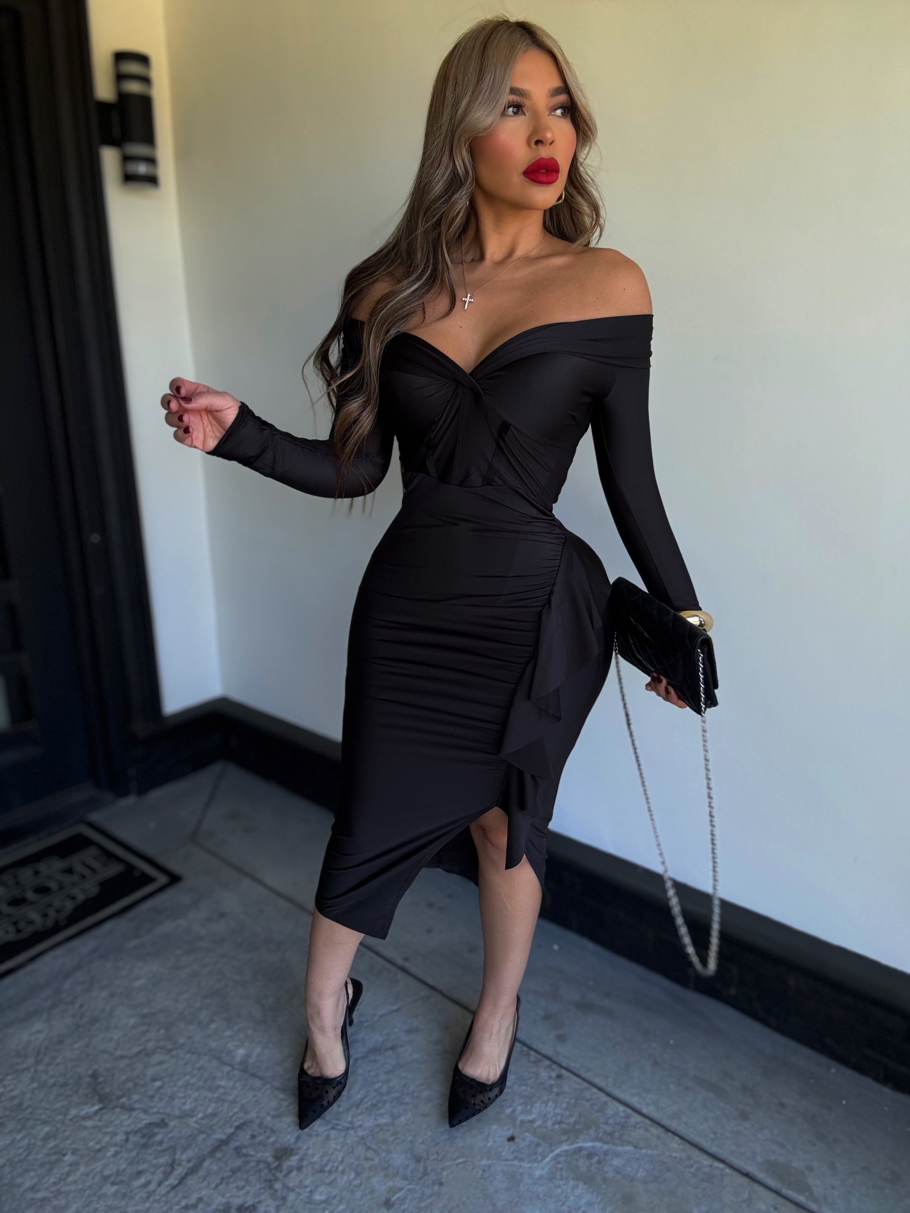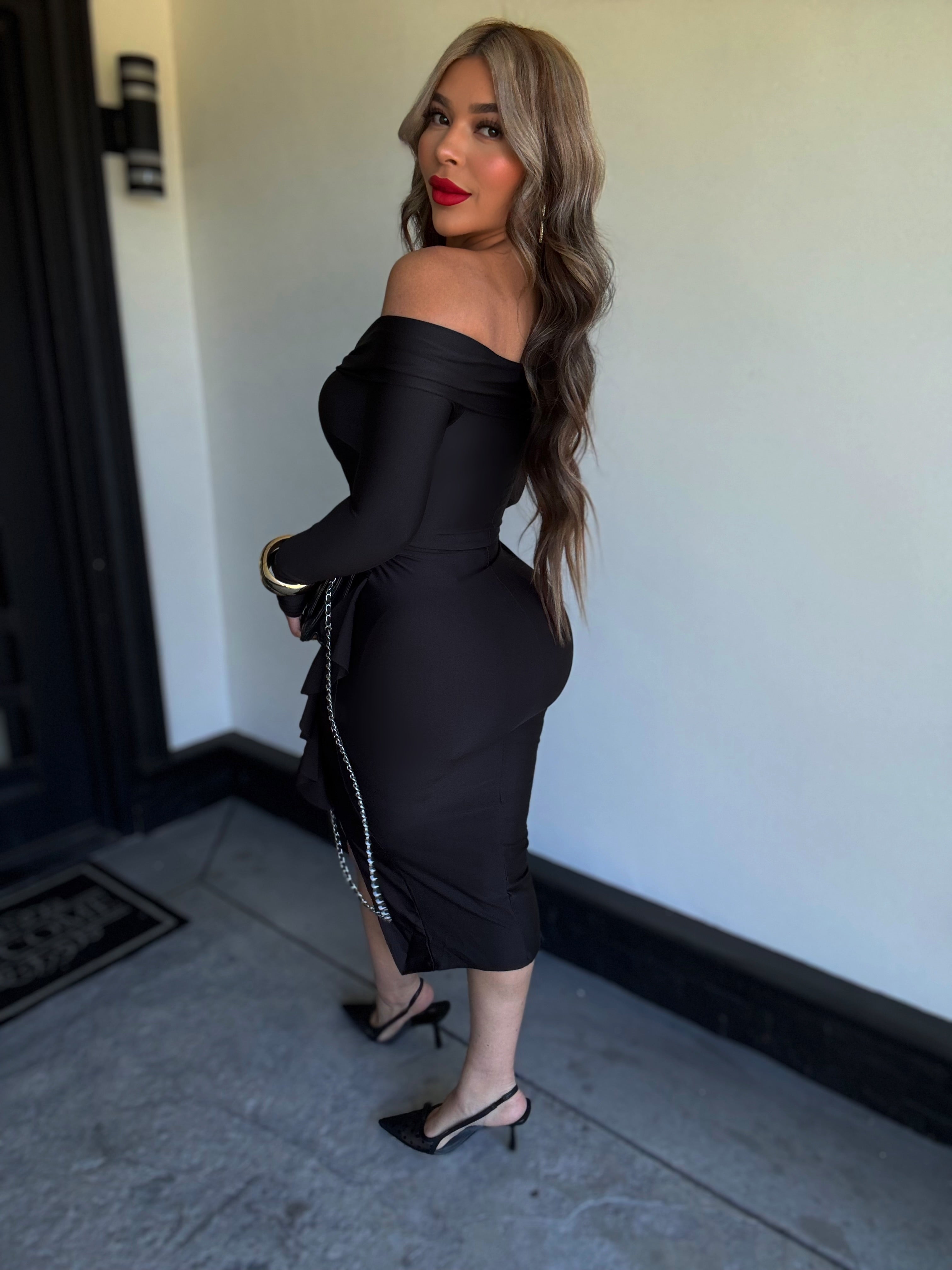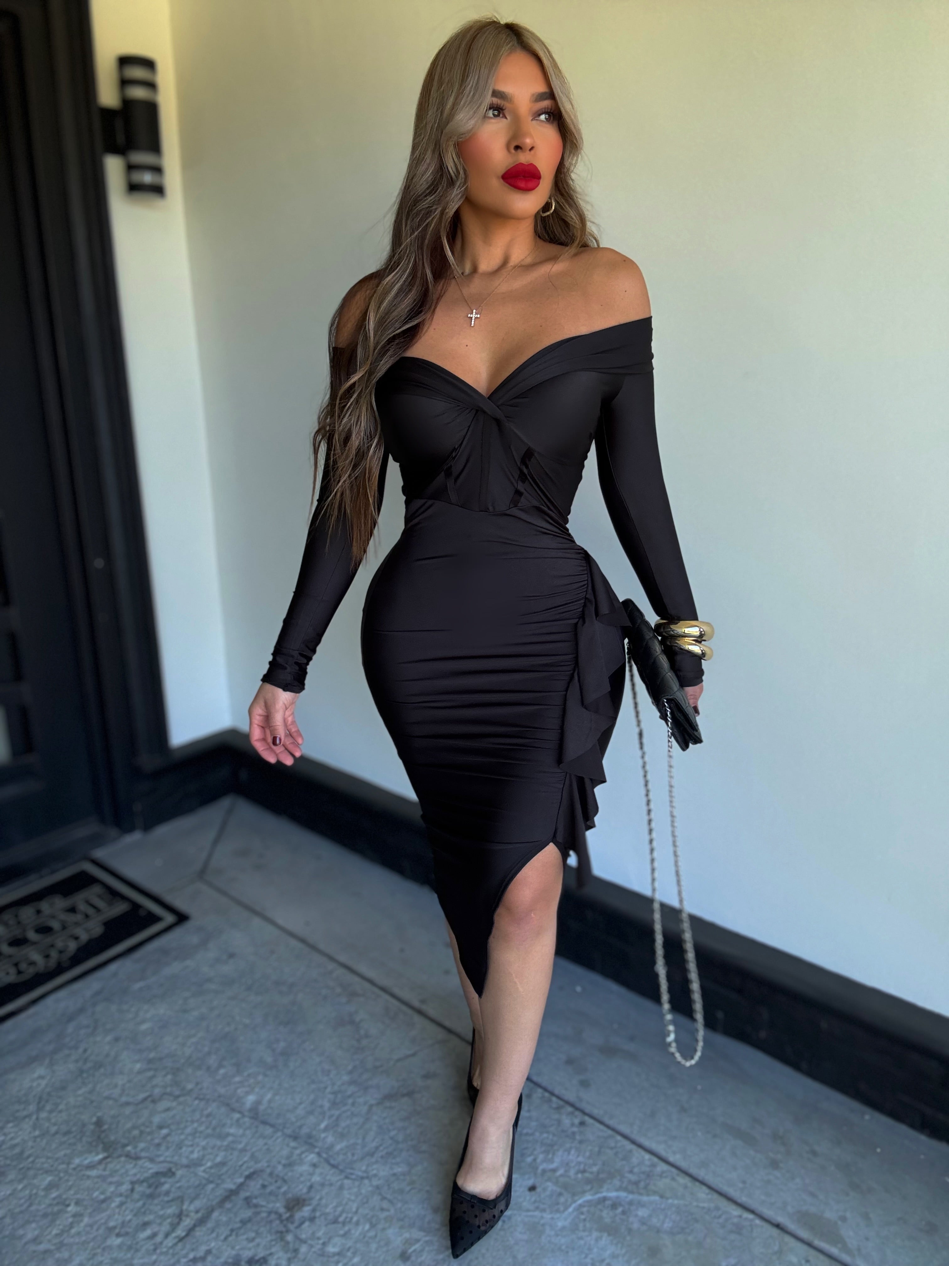 Details : Long sleeve midi dress made from spandex stretch material model is wearing size small , model is 5.5 height , 38 in bust , 25 in waist and 42 in hips .
