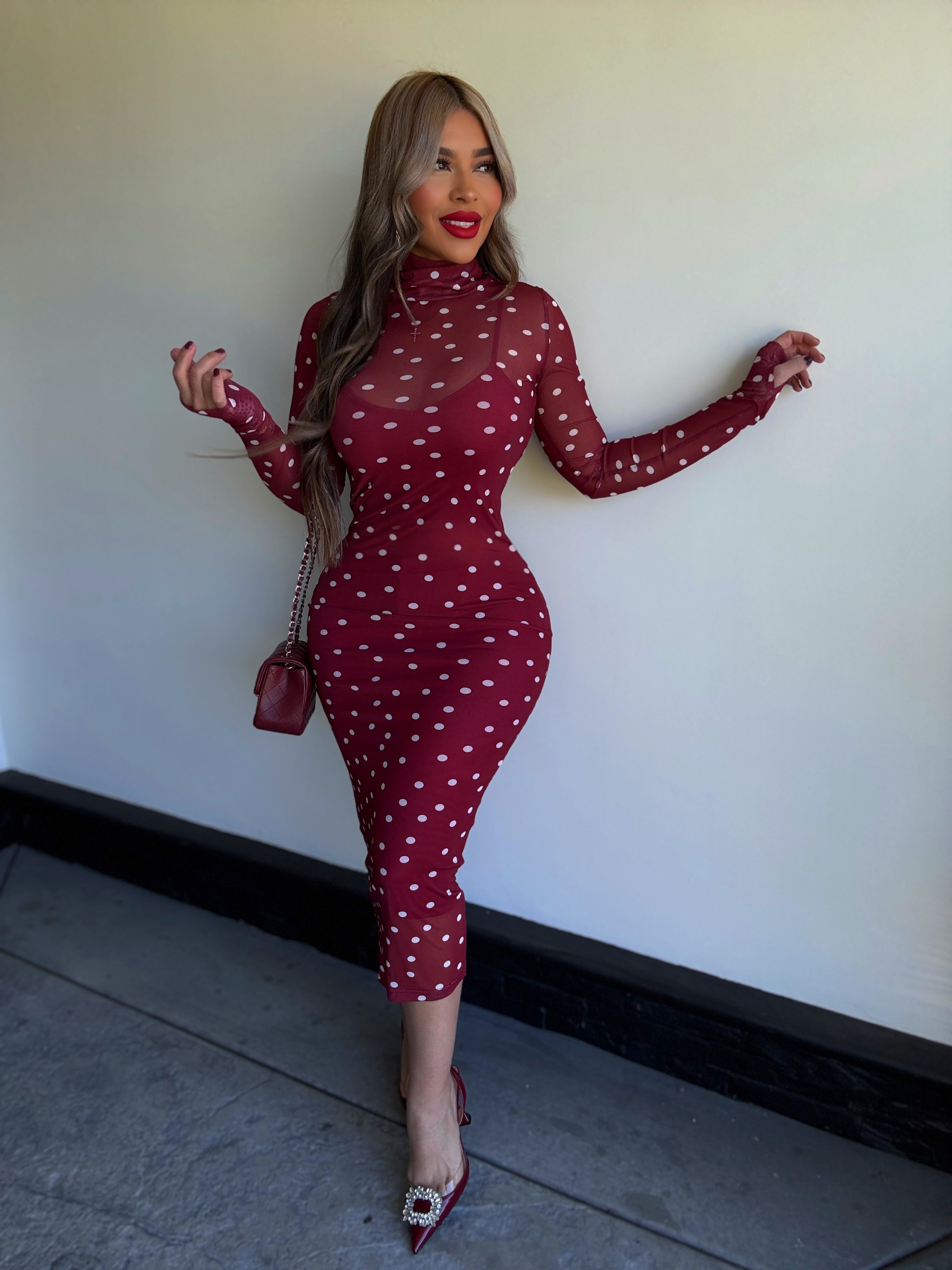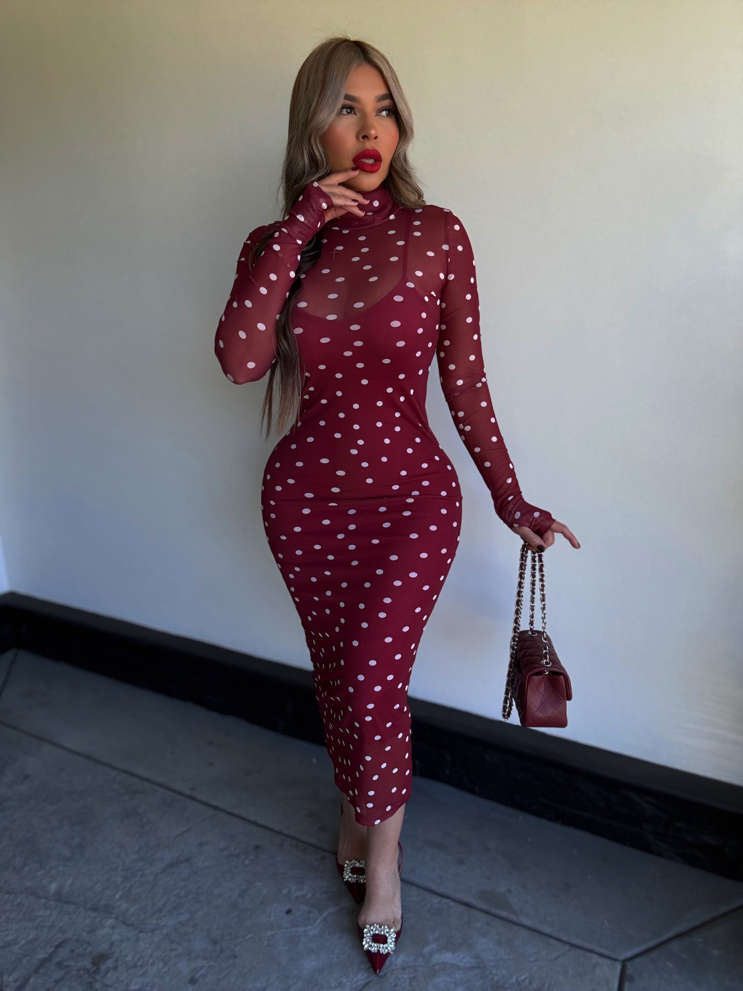 Details : Long sleeve midi mesh dress made from stretch material model is wearing size small , model is 5.5 height , 38 in bust , 25 in waist and 42 in hips .