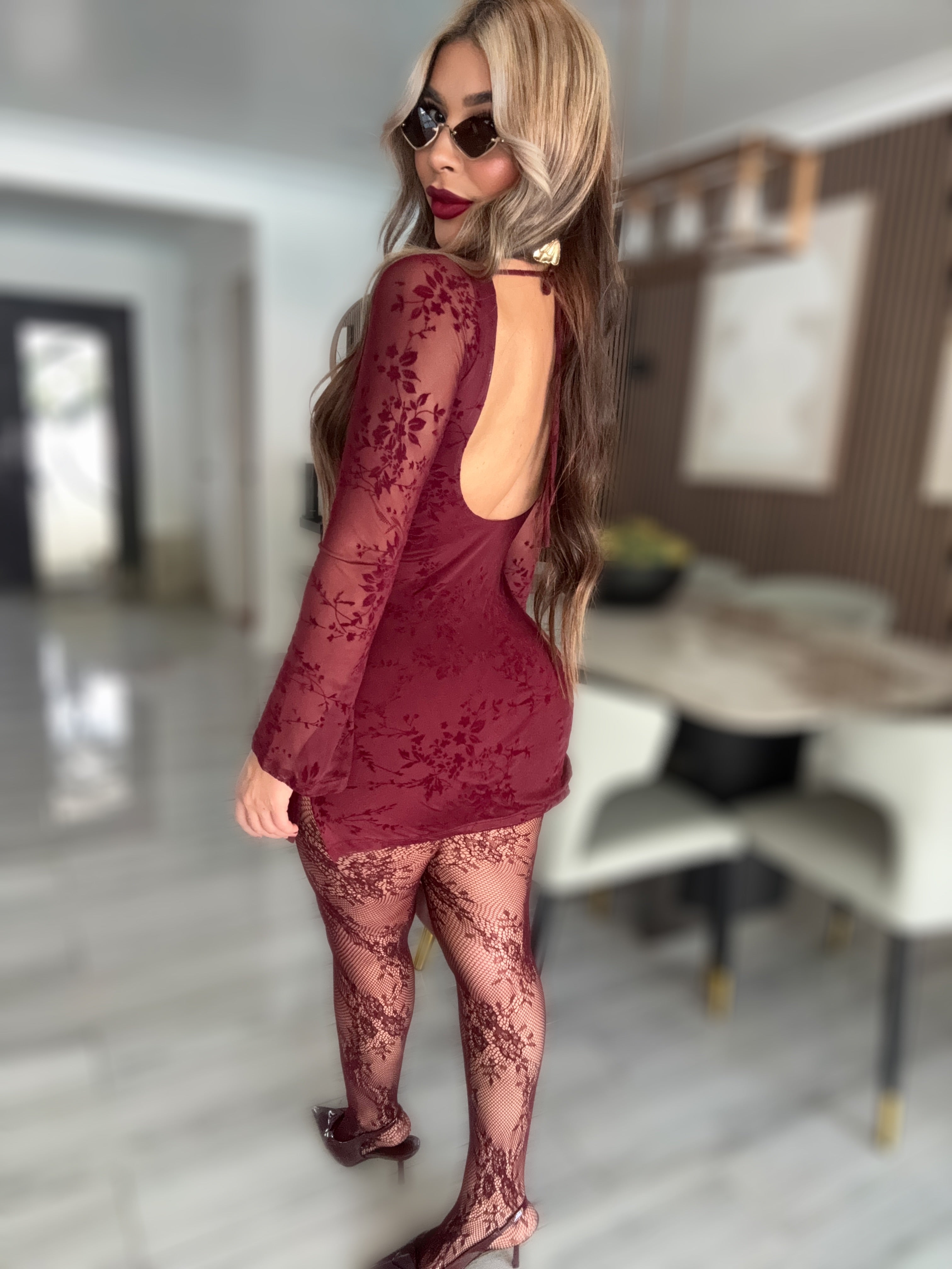 Details : Long sleeve mini dress made from spandex stretch material  model is wearing size small , model is 5.5 height , 38 in bust , 25 in waist and 42 in hips .
