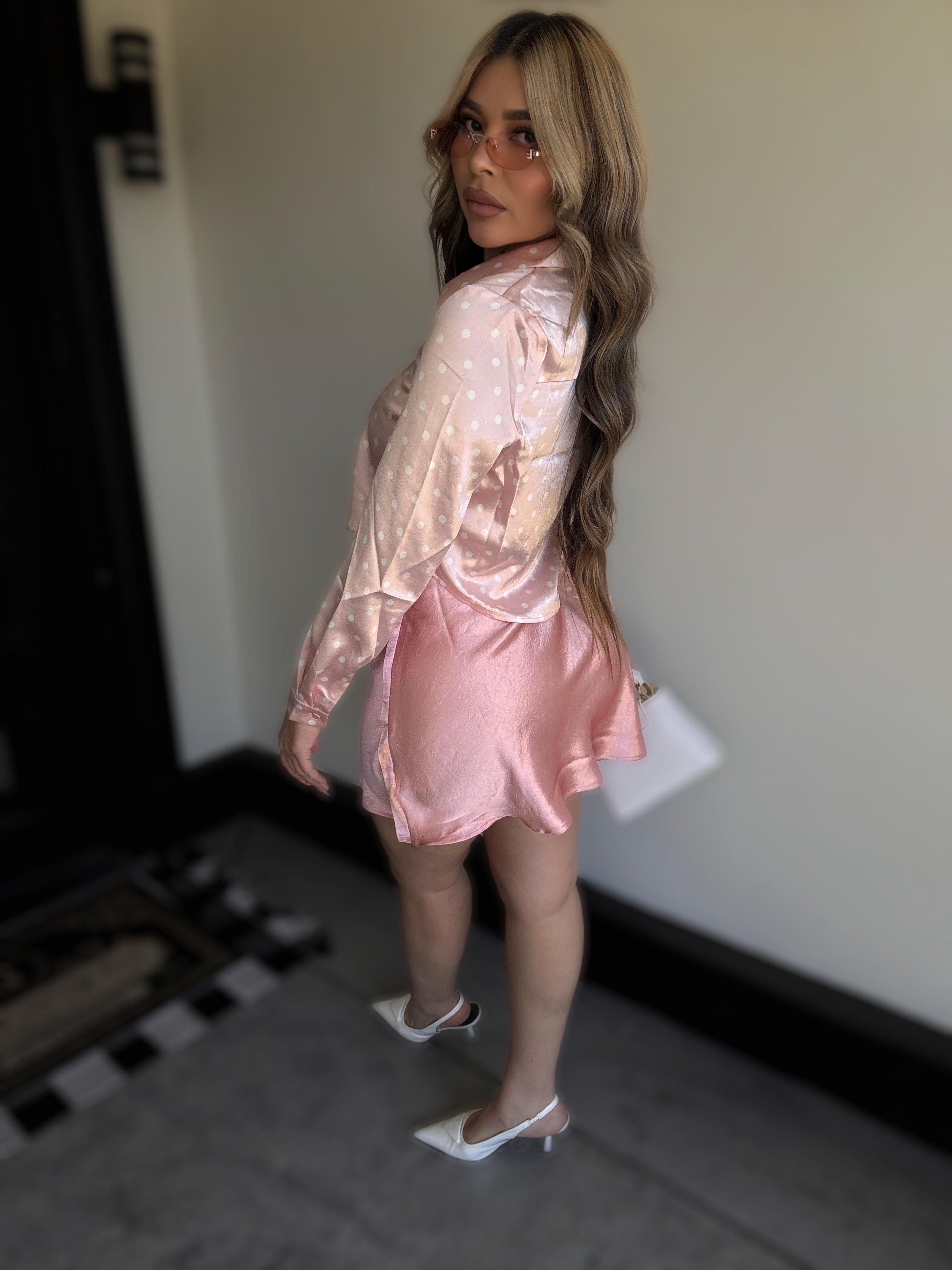 Details : Pink mini skirt made from satin stretch fabric model is wearing size small , model is 5.5 height , 25 in waist and 42 in hips .