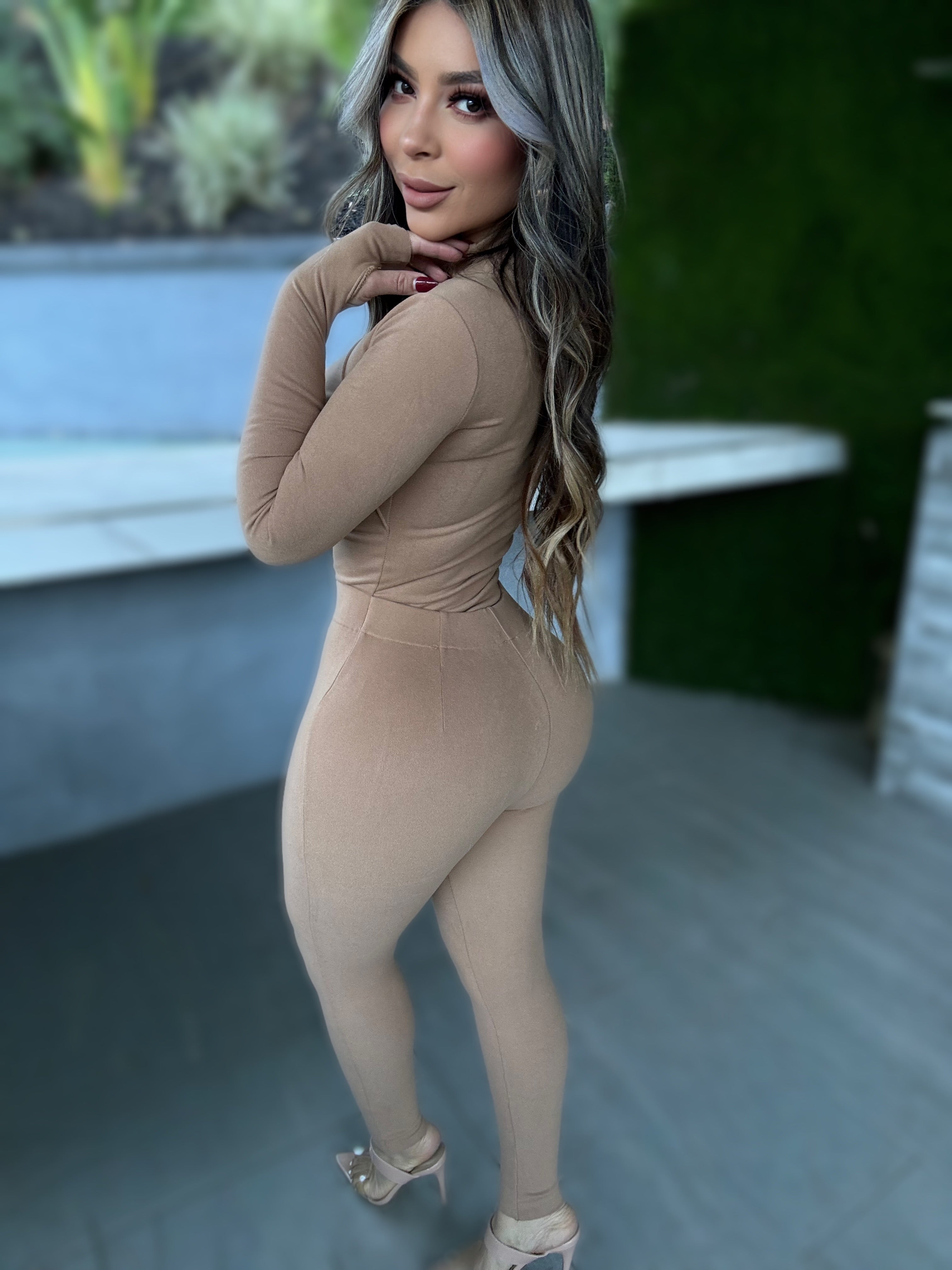 Details : Long sleeve top and high waisted pants set made from stretch fabric, model is wearing size small, model is 5.5 height , 38 in bust, 25 in waist and 42 in hips .