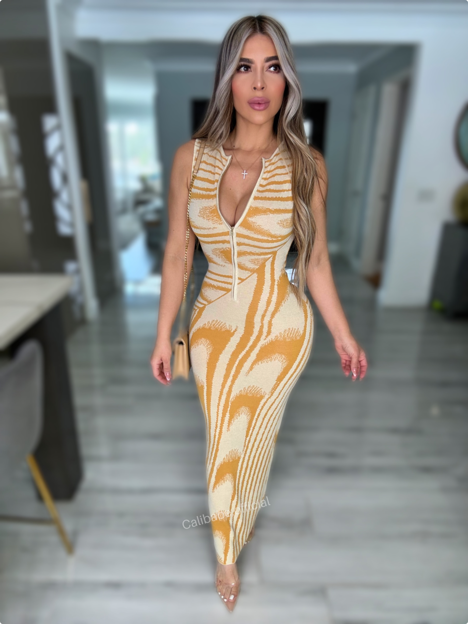 Details: Maxi dress made from thick stretch material model is wearing size small , model is 5.5 height , 38 in bust , 25 in waist and 42 in hips .