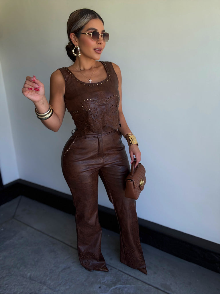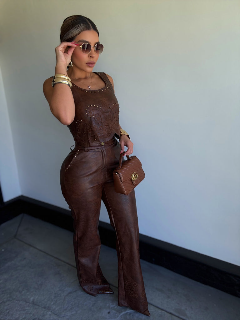 Details: Sleeveless cropped top with pants set made from faux leather material with stretch , very comfortable model is wearing size small ,model is 5.5 height , 38 in bust , 24 in waist and 42 in hips .